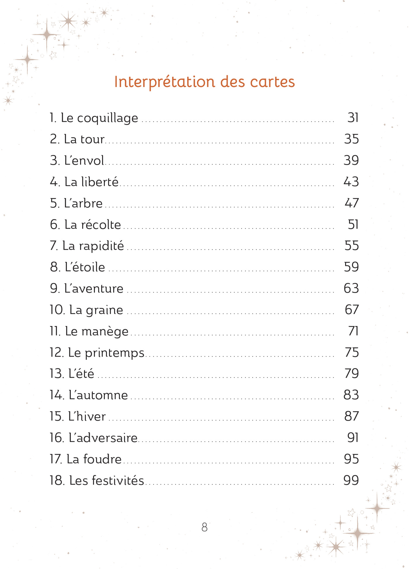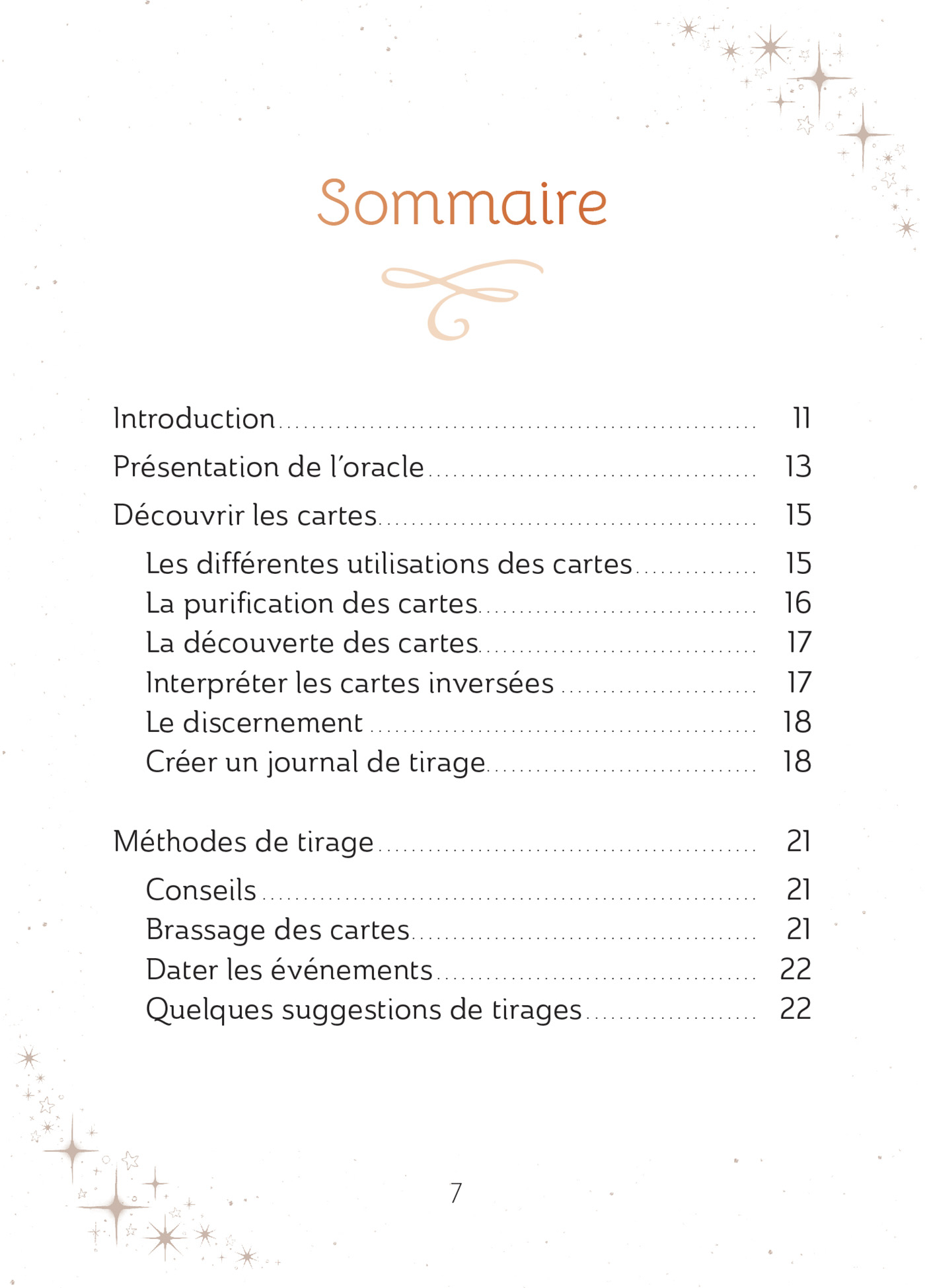 L’oracle Lumière d’étoile vous invite à rêver et vous entraîne dans un monde fantastique, doux et poétique. Les âmes rêveuses seront les personnages oniriques qui viendront à votre rencontre au travers des cartes pour répondre à vos doutes et interrogations. Les 50 cartes peuvent être utilisées aussi bien pour faire de la divination que pour recevoir une guidance spirituelle. Pour chacune d’elles, vous trouverez sa signification, des mots-clés, une prédiction et la clé intérieure qui vous permettra de travailler sur vos parts d'ombre.