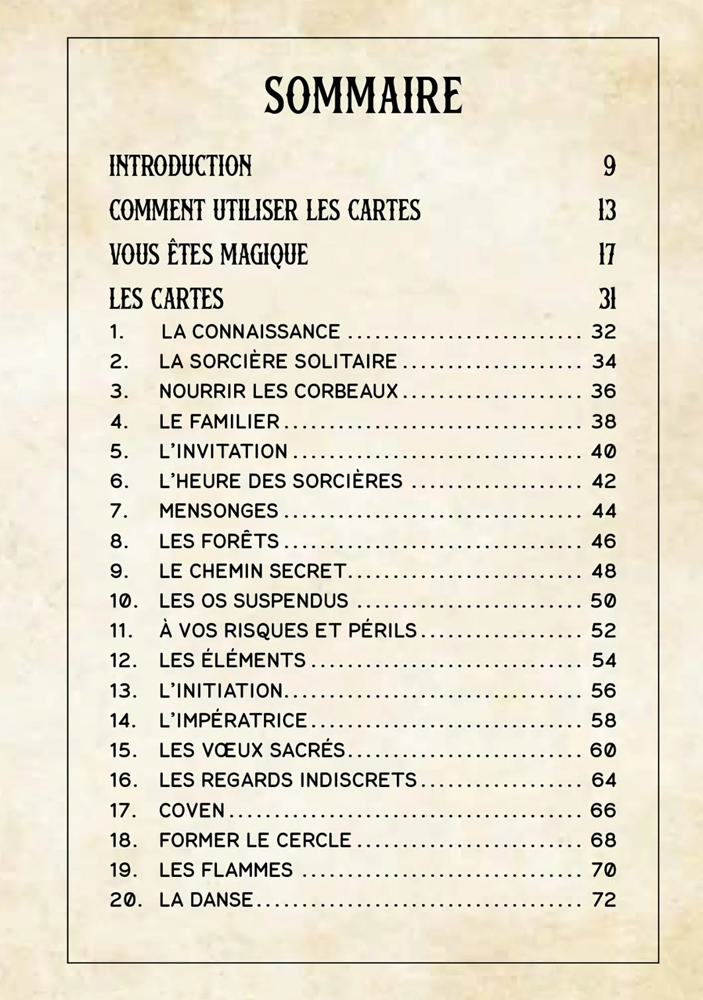 Chacune de ces 44 superbes cartes représente une étape de votre cheminement personnel et vous permettra d’éveiller la sorcière qui sommeille en vous et de vous réaliser pleinement.