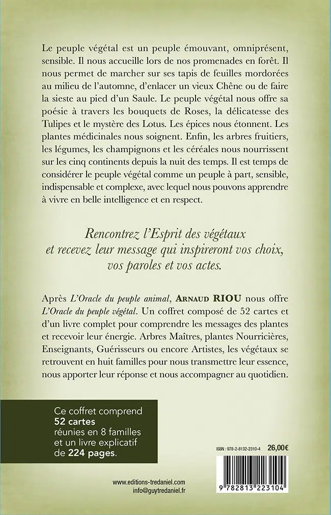 Après L’Oracle du peuple animal, Arnaud RIOU nous offre L’Oracle du peuple végétal. Un coffret composé de 52 cartes d'enseignement et d’un livre complet pour comprendre les messages des plantes et recevoir leur énergie. Arbres Maîtres, plantes Nourricières, Enseignants, Guérisseurs ou encore Artistes, les végétaux se retrouvent en huit familles pour nous transmettre leur essence, nous apporter leur réponse et nous accompagner au quotidien.