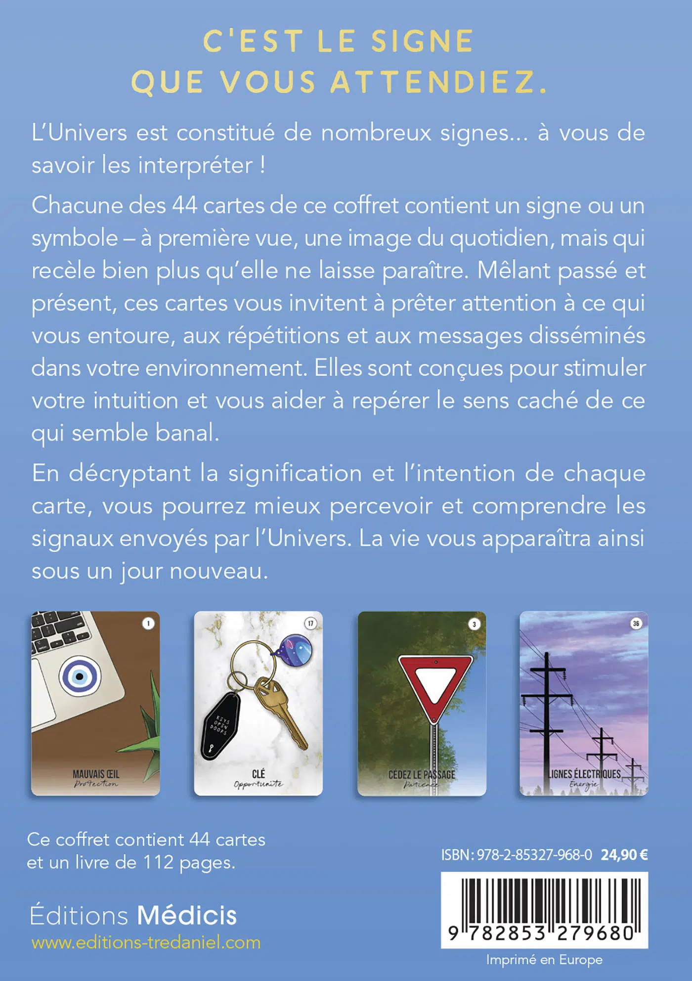 Chacune des 44 cartes de ce coffret contient un signe ou un symbole – à première vue, une image du quotidien, mais qui recèle bien plus qu’elle ne laisse paraître. Mêlant passé et présent, ces cartes vous invitent à prêter attention à ce qui vous entoure, aux répétitions et aux messages disséminés dans votre environnement. Elles sont conçues pour stimuler votre intuition et vous aider à repérer le sens caché de ce qui semble banal.