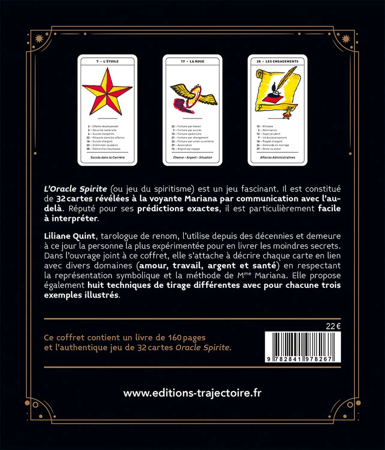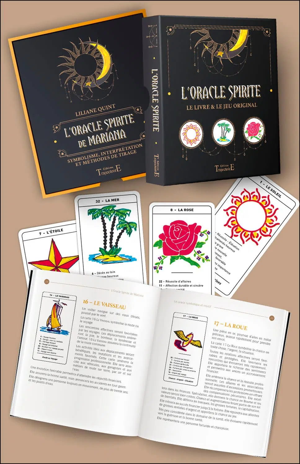 Liliane Quint, tarologue de renom, l’utilise depuis des décennies et demeure à ce jour la personne la plus expérimentée pour en livrer les moindres secrets. Dans l’ouvrage joint à ce coffret, elle s’attache à décrire chaque carte en lien avec divers domaines (amour, travail, argent et santé) en respectant la représentation symbolique et la méthode de Mme Mariana. Elle propose également huit techniques de tirage différentes avec pour chacune trois exemples illustrés.