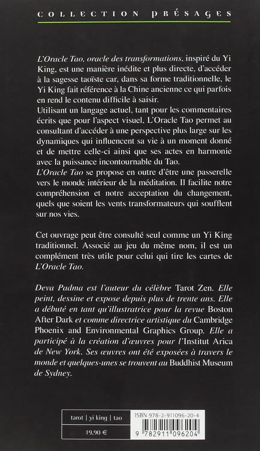 Ce livre permet une utilisation optimale du jeu Oracle Tao, un jeu de 64 cartes illustrant les valeurs des 64 hexagrammes chinois du Yi King (appelé "Livre des Transformations"). Manière inédite et plus directe d'accéder à la sagesse taoïste, cet ouvrage peut aussi être consulté seul (sans le jeu), comme un Yi King traditionnel.