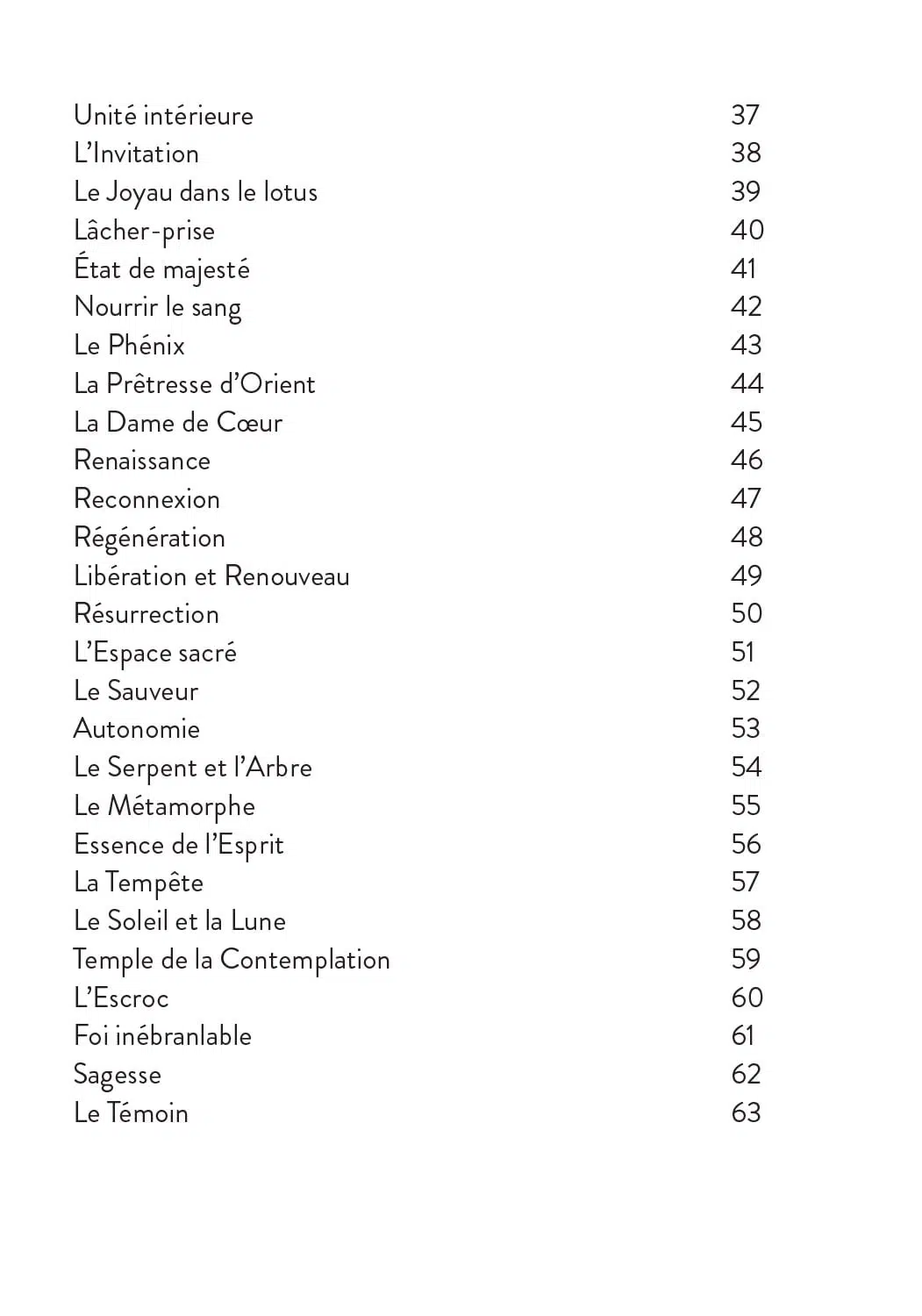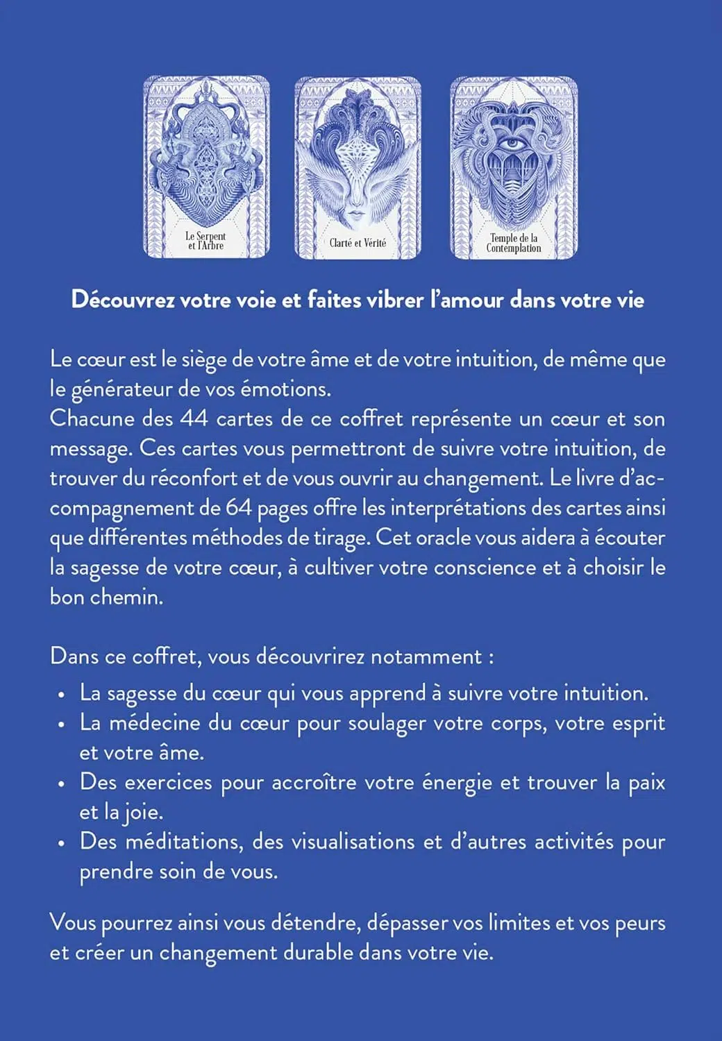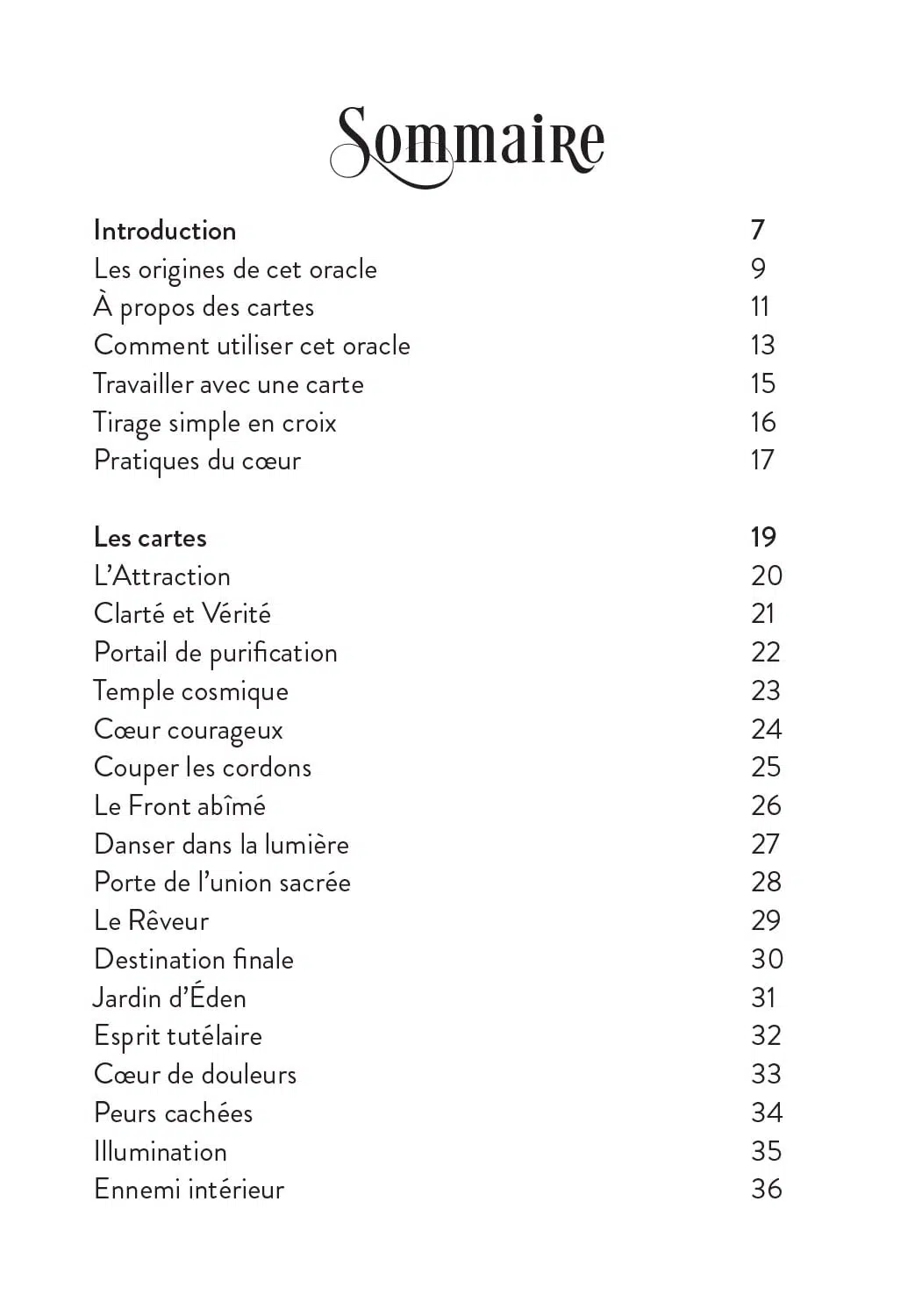 Chacune des 44 cartes de ce coffret représente un cœur et son message. Ces cartes vous permettront de suivre votre intuition, de trouver du réconfort et de vous ouvrir au changement. Le livre d'accompagnement de 64 pages offre les interprétations des cartes ainsi que différentes méthodes de tirage. Cet oracle vous aidera à écouter la sagesse de votre cœur, à cultiver votre conscience et à choisir le bon chemin.Dans ce coffret, vous découvrirez notamment :