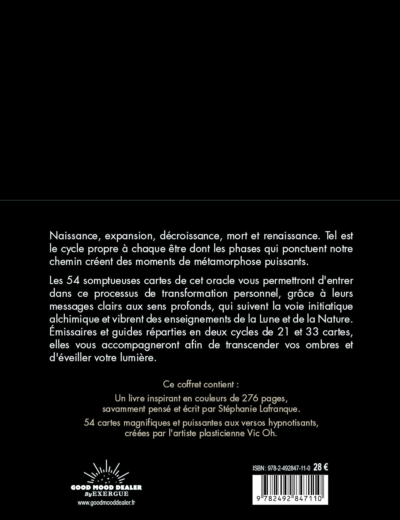 Les 54 somptueuses cartes d'enseignement de cet oracle vous permettront d'entrer dans ce processus de transformation personnel, grâce à leurs messages clairs aux sens profonds, qui suivent la voie initiatique alchimique et vibrent des enseignements de la Lune et de la Nature. Émissaires et guides réparties en deux cycles de 21 et 33 cartes, elles vous accompagneront afin de transcender vos ombres et d'éveiller votre lumière.