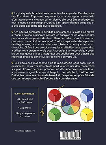 On pourrait comparer le pendule à une antenne : il aide à se mettre à l'écoute de son intuition en captant les énergies et les vibrations des personnes, des objets ou des lieux. Dans ce coffret, vous trouverez un pendule en métal doré accompagné d'un livre explicatif et d'une planche de diagrammes, pour vous initier avec clarté à la pratique de cet art divinatoire. Grâce à des exercices simples et détaillés, vous apprendrez à utiliser votre propre énergie pour l'accorder à votre pendule, à poser les bonnes questions et à interpréter ses oscillations pour obtenir des réponses précises dans tous les domaines de votre vie.