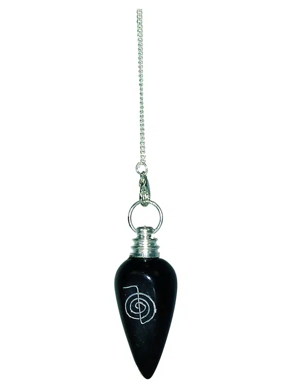 Ce pendule en pierre naturelle est gravé du symbole issu du Reiki traditionnel : Cho Ku Rei (amplifiant les énergies perçue et projetée).