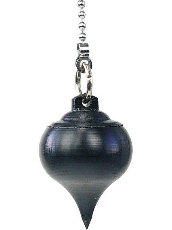 Les pendules dits "à témoin" sont des pendules creux à l'intérieur desquels il est possible de mettre un élément pour spécifier ses recherches. Un peu d'eau pour les sources, d'or pour les trésors, une mèche de cheveux pour une personne disparue... Son usage est très répandu dans le domaine de la radiesthésie comme de la géobiologie. Ici, la partie supérieure du pendule se dévisse pour accéder à cette chambre et se revisse simplement pour la refermer.