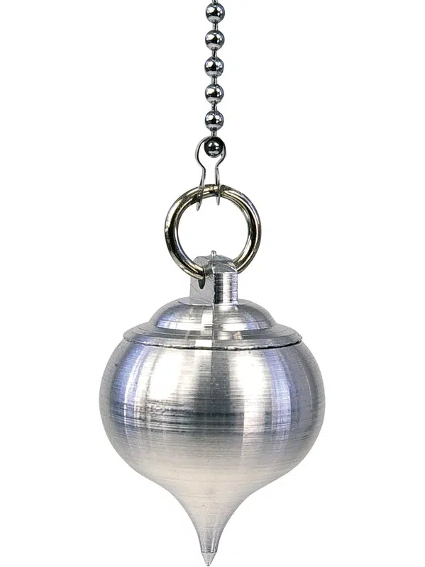 Les pendules dits "à témoin" sont des pendules creux à l'intérieur desquels il est possible de mettre un élément pour spécifier ses recherches. Un peu d'eau pour les sources, d'or pour les trésors, une mèche de cheveux pour une personne disparue... Son usage est très répandu dans le domaine de la radiesthésie comme de la géobiologie. Ici, la partie supérieure du pendule se dévisse pour accéder à cette chambre et se revisse simplement pour la refermer.
