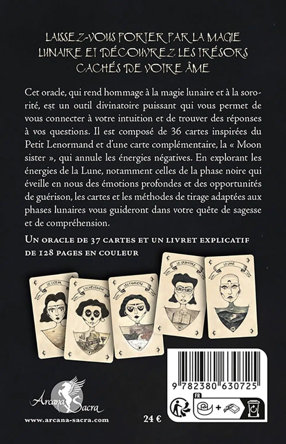Cet oracle, qui rend hommage à la magie lunaire et à la sororité, est un outil divinatoire puissant qui vous permet de vous connecter à votre intuition et de trouver des réponses à vos questions. Il est composé de 36 cartes inspirées du Petit Lenormand et d'une carte complémentaire, la « Moon sister », qui annule les énergies négatives.