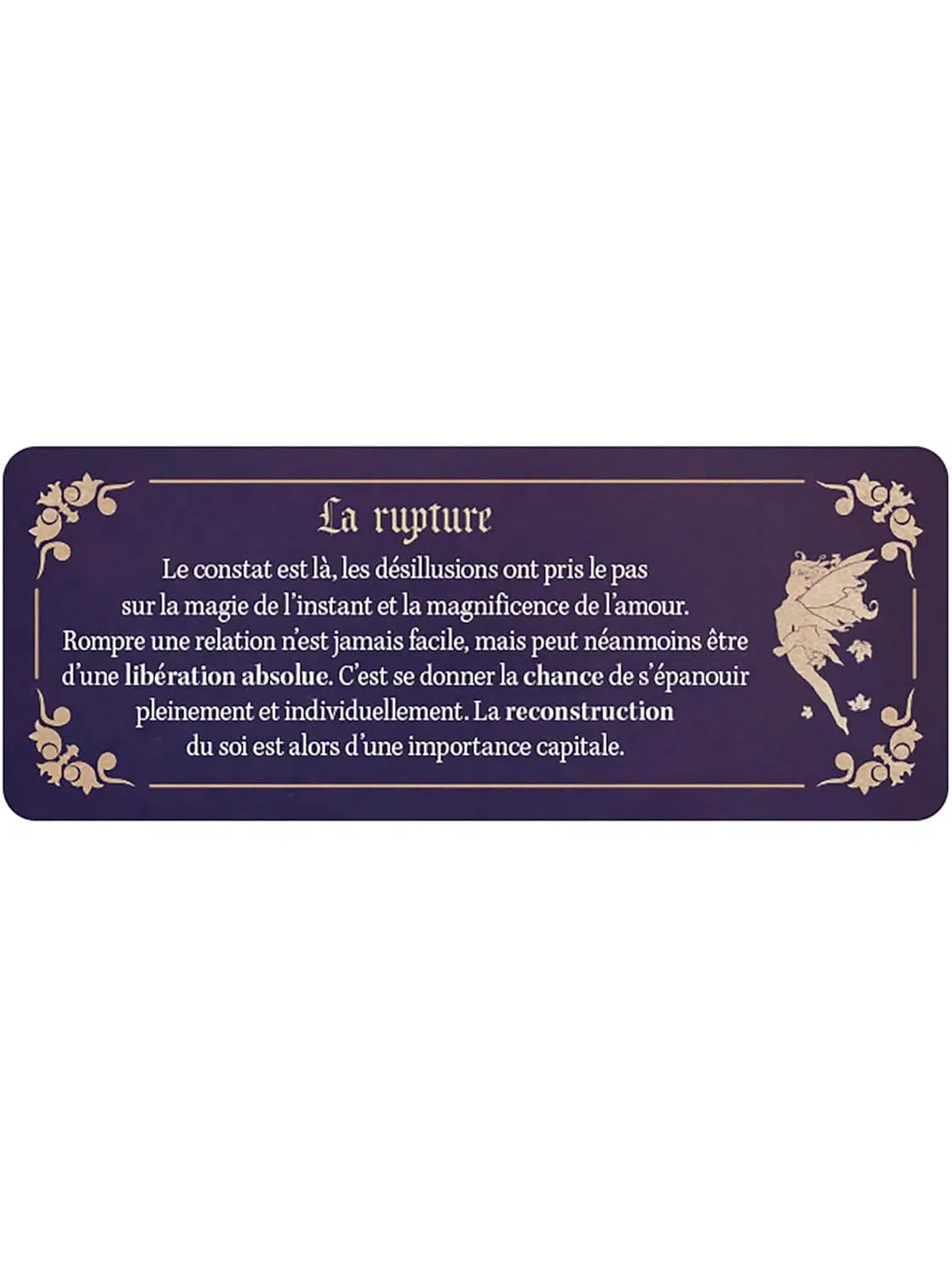 Voir naître ses sentiments, faire face au rejet, traverser toutes les étapes d'une séparation, se reconstruire... Grâce aux 45 cartes porteuses des messages éclairants des fées, tu recevras chaque jour une guidance qui te délivrera un conseil ou t'aidera à travailler sur tes blocages du passé.