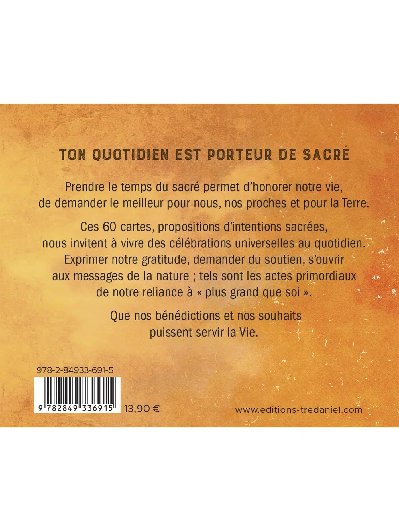 Ces 60 cartes, propositions d’intentions sacrées, nous invitent à vivre des célébrations universelles au quotidien. Exprimer notre gratitude, demander du soutien, s’ouvrir aux messages de la nature ; tels sont les actes primordiaux de notre reliance à « plus grand que soi ».