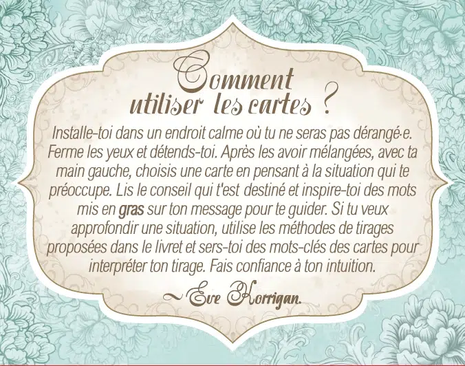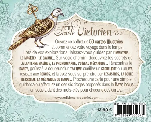 Cet oracle vous invite dans un voyage spirituel au cœur de l’époque victorienne. Période riche en personnages hauts en couleur, savoureuse par ses coutumes et tendances, créative et excitante par ses inventions et le désir de croissance, de prospérité et d’amour, laissez-vous transporter par cet univers fascinant, vecteur des messages de guidance.