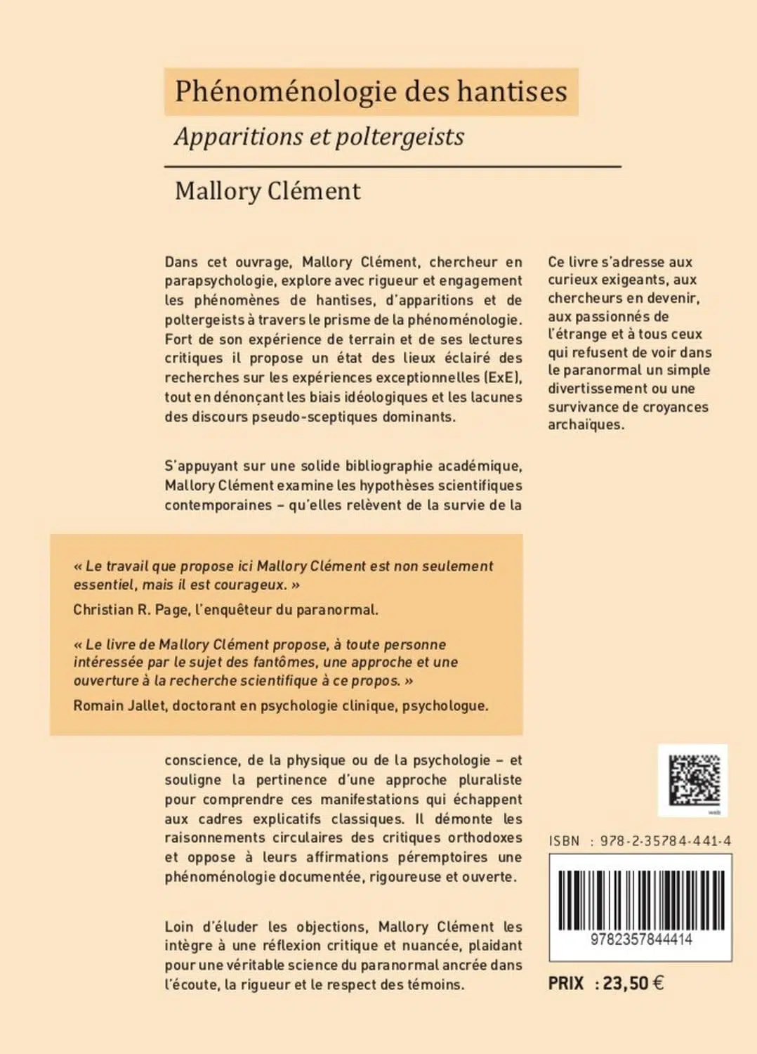Dans ce nouvel ouvrage, Mallory Clément, chercheur indépendant en parapsychologie, explore avec rigueur et engagement les phénomènes de hantises, d’apparitions et de poltergeists à travers le prisme de la phénoménologie. Fort de son expérience de terrain, de ses lectures critiques et de sa participation à l’A-IMI, l’auteur propose un état des lieux éclairé des recherches sur les expériences exceptionnelles (ExE), tout en dénonçant les biais idéologiques et les lacunes des discours pseudo-sceptiques dominants.