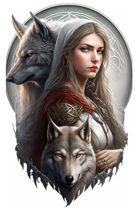 Plaque métal : Femme avec 2 loups - 30x48cm