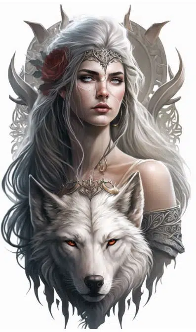Plaque métal : Femme avec rose dans les cheveux & 1 loup - 29x48cm