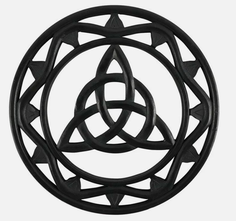 Puisant ses origines dans la tradition celte, la Triquetra ou "Nœud de la trinité" est un symbole ancien qui à mesure du temps s'est adapté à de nombreuses traditions (nordique, chrétienne, etc.). Elle évoque toute forme de trinité : la cosmogonie celte terre/mer/ciel, ou encore les visages de la triple déesse (jeune fille/mère/ancienne), la trinité chrétienne du père/fils/saint esprit, les cycles vie/mort/renaissance...