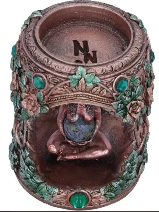 Porte bougie chauffe-plat délicat, en résine-bronze peinte, incrusté de cristaux verts.