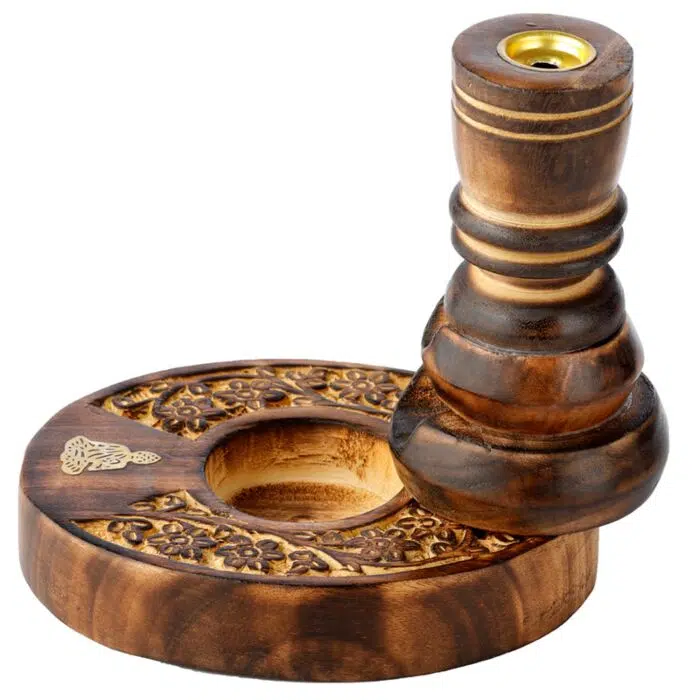 Ce modèle élégant en bois peut aussi être utilisé avec une bougie chauffe-plat sans la base su réceptacle. Auquel cas, la fumée de l'encens s'écoulera sur celle-ci en cascade.