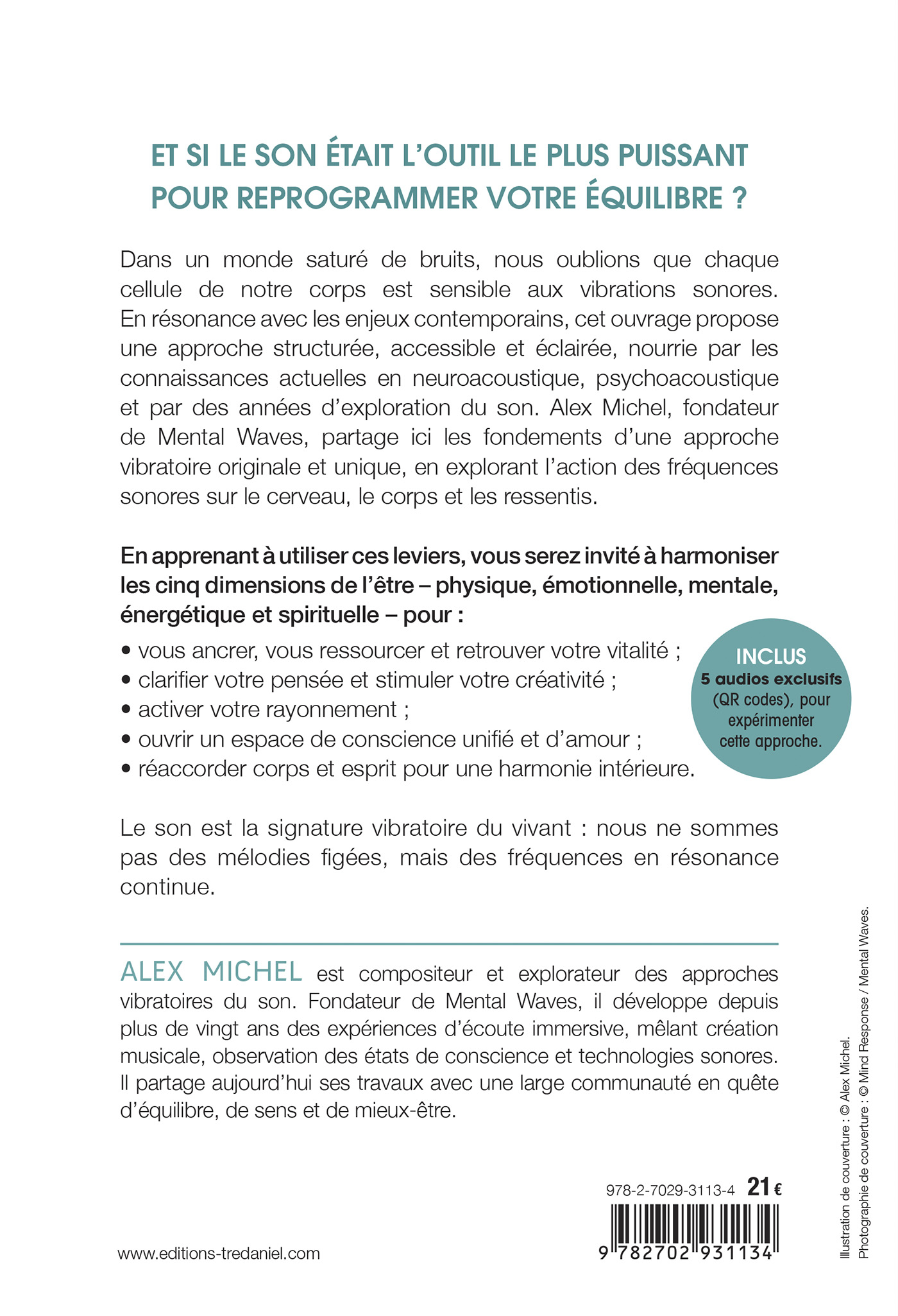 Dans un monde saturé de bruits, nous oublions que chaque cellule de notre corps est sensible aux vibrations sonores. En résonance avec les enjeux contemporains, cet ouvrage propose une approche structurée, accessible et éclairée, nourrie par les connaissances contemporaines en neuroacoustique, psychoacoustique et par des années d’exploration du sonore. Alex Michel, fondateur de Mental Waves, partage ici les fondements d’une approche vibratoire originale et unique, en explorant l’action des fréquences sonores sur le cerveau, le corps et les ressentis.