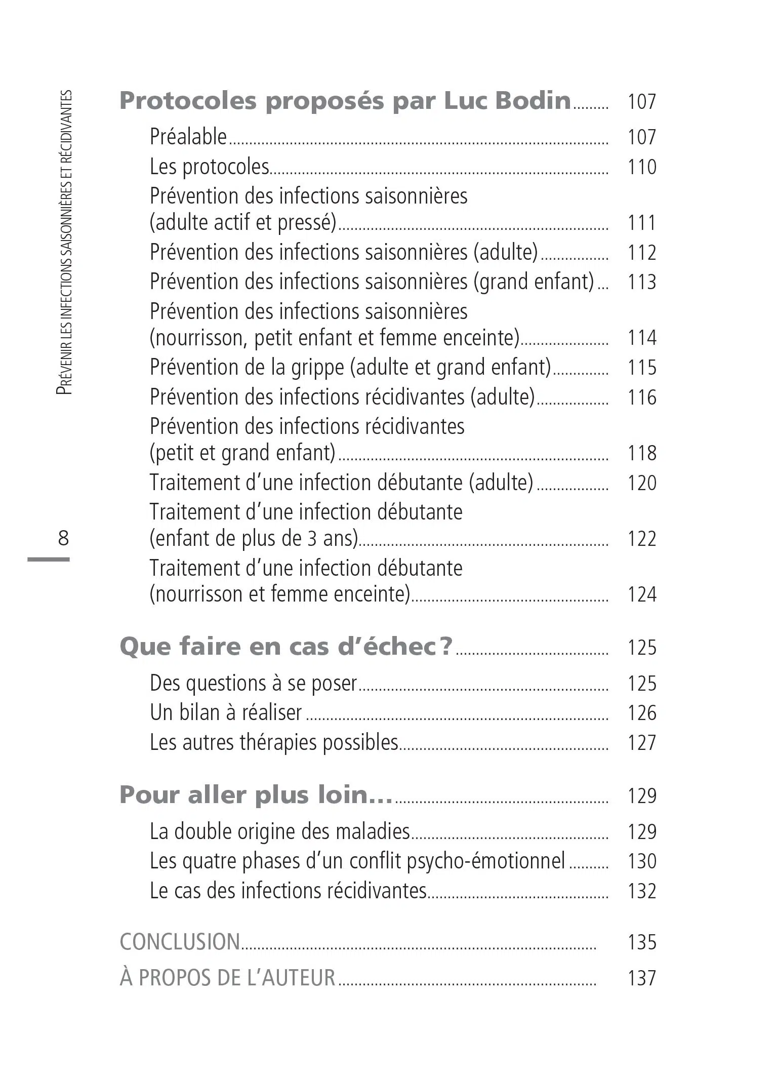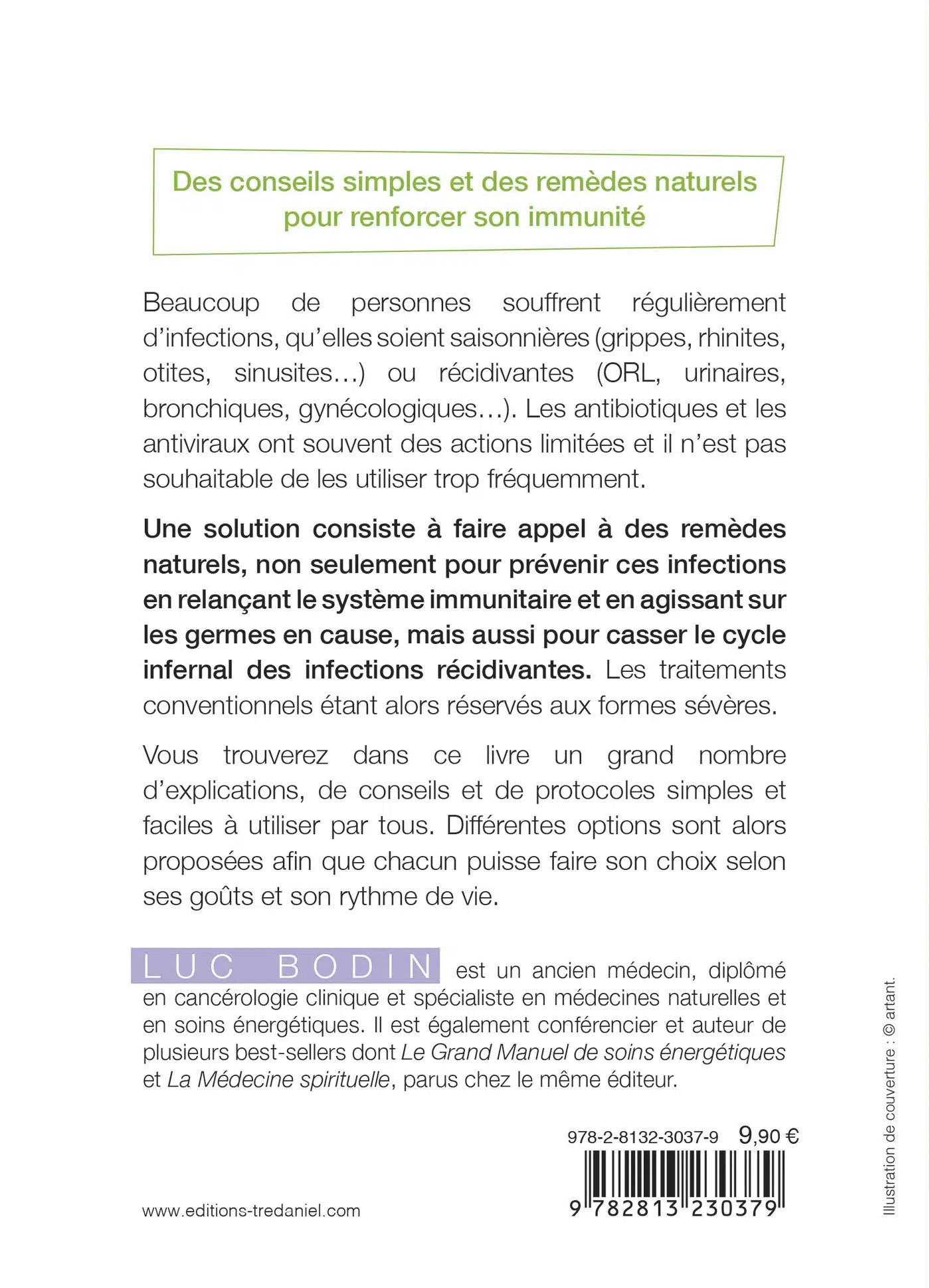 Répondant à un phénomène courant, ce livre propose de se pencher sur les infections qui reviennent régulièrement, qu’elles soient saisonnières (grippes, otites, etc.) ou récidivantes (orl, urinaire, etc.). Plutôt que de rester limités aux traitements antibiotiques et antiviraux, l’auteur propose ici de valoriser le système immunitaire de chacun par des méthodes simples et naturelles. Soulignant les raisons des maladies et proposant des pistes immunitaires, Luc Bodin liste ensuite ses propres protocoles pour différentes affections, adaptés à différents cas.