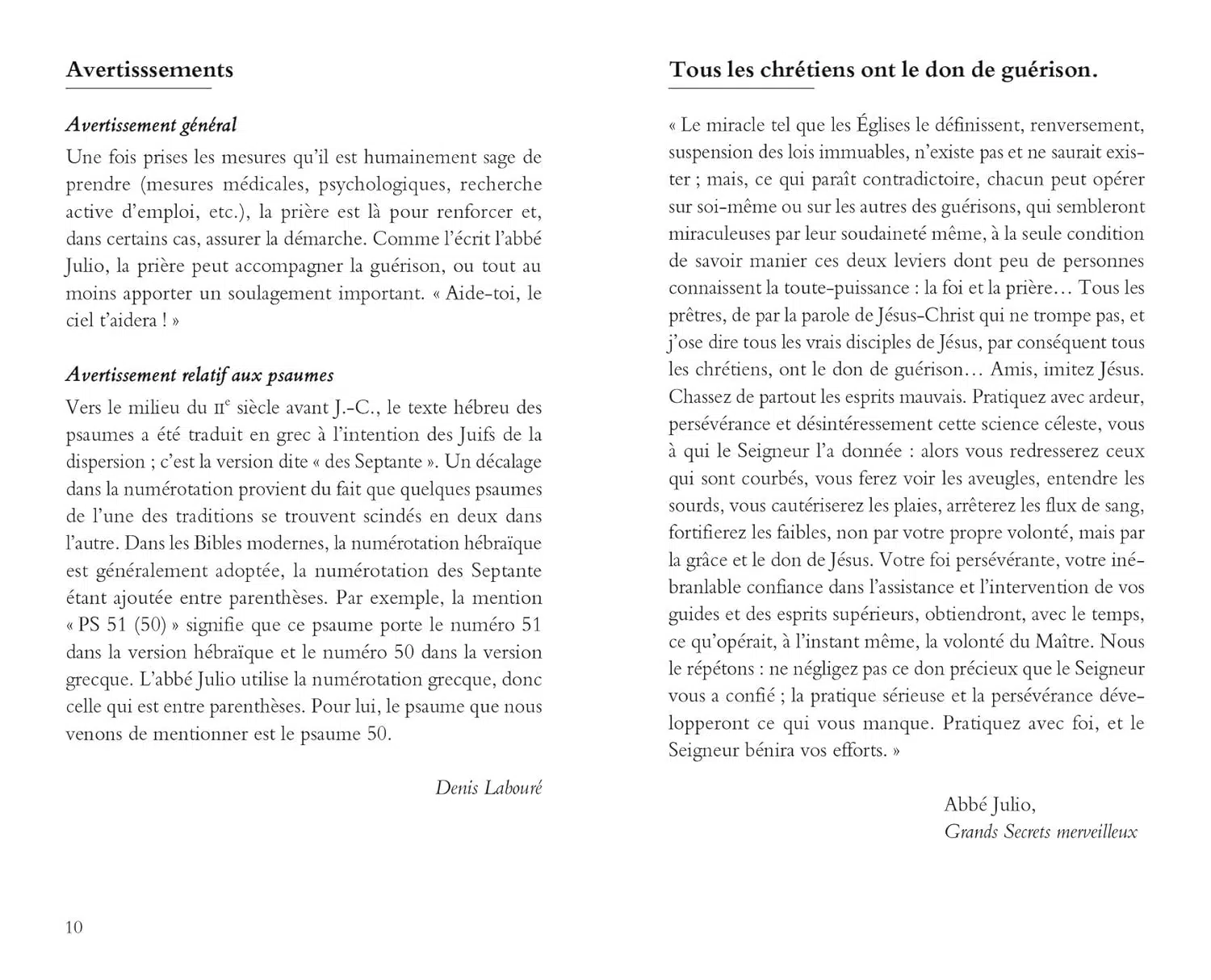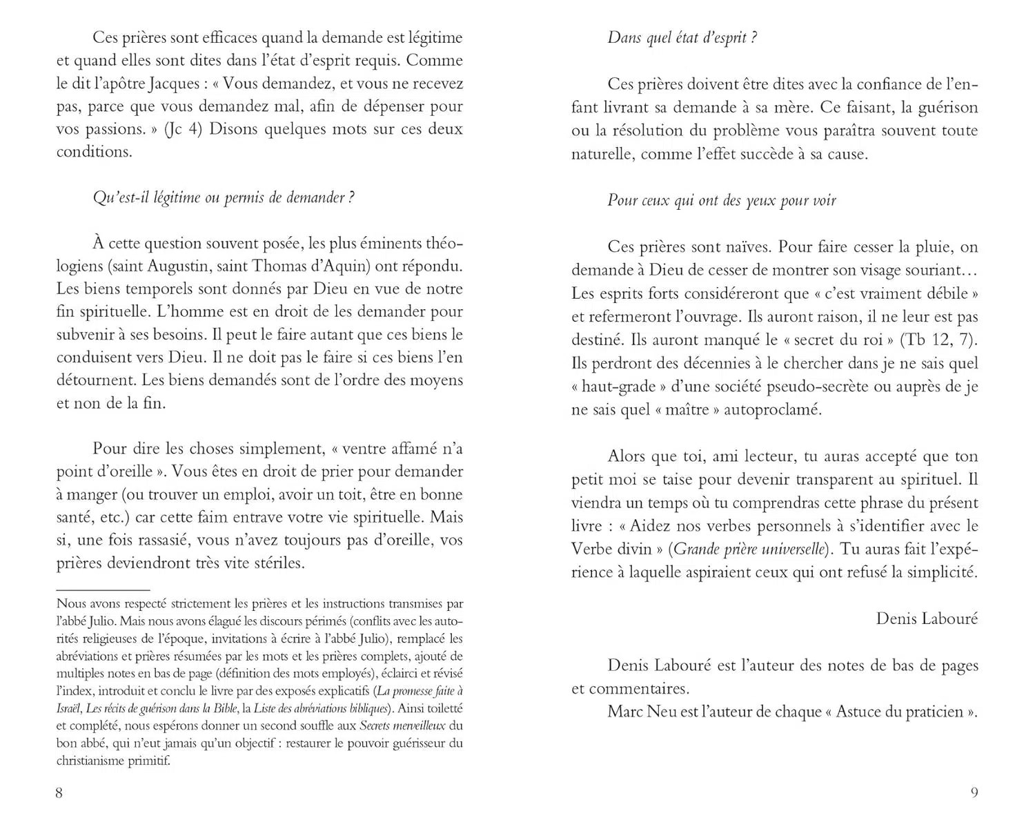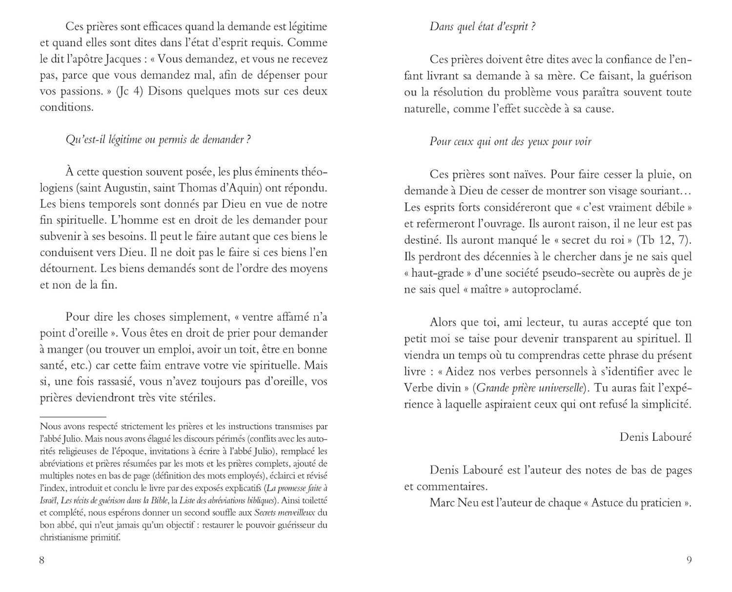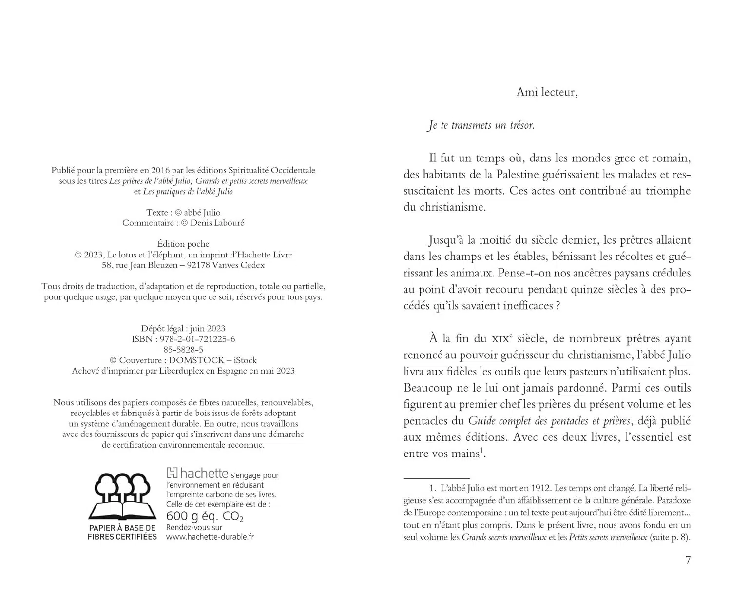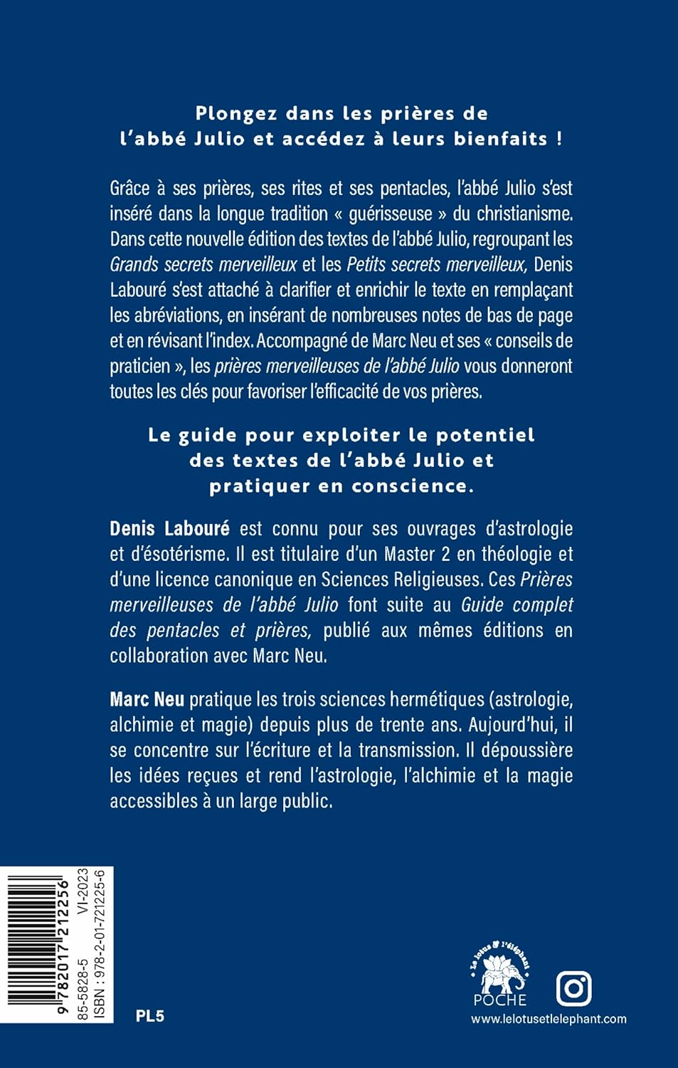 Grâce à ses prières, ses rites et ses pentacles, l'abbé Julio s'est inséré dans la longue tradition « guérisseuse » du christianisme. Dans cette nouvelle édition des textes de l'abbé Julio, regroupant les Grands secrets merveilleux et les Petits secrets merveilleux, Denis Labouré s'est attaché à clarifier et enrichir le texte en remplaçant les abréviations, en insérant de nombreuses notes de bas de page et en révisant l'index. Accompagné de Marc Neu et ses « conseils de praticien », les prières merveilleuses de l'abbé Julio vous donneront toutes les clés pour favoriser l'efficacité de vos prières.