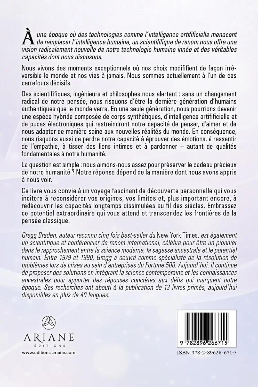 Scientifiques, ingénieurs et philosophes nous alertent : sans une transformation profonde de notre pensée, nous risquons de devenir la dernière génération de purs humains. En l’espace d’une génération, nous pourrions nous transformer en une espèce hybride, composée de parties synthétiques, d’intelligence artificielle et de puces électroniques qui restreindraient notre capacité à penser, à aimer et à nous adapter sainement aux nouvelles réalités du monde. En conséquence, nous risquerions de perdre nos capacités à éprouver des émotions, de l’empathie et du pardon – les traits que nous estimons et chérissons le plus dans notre humanité.