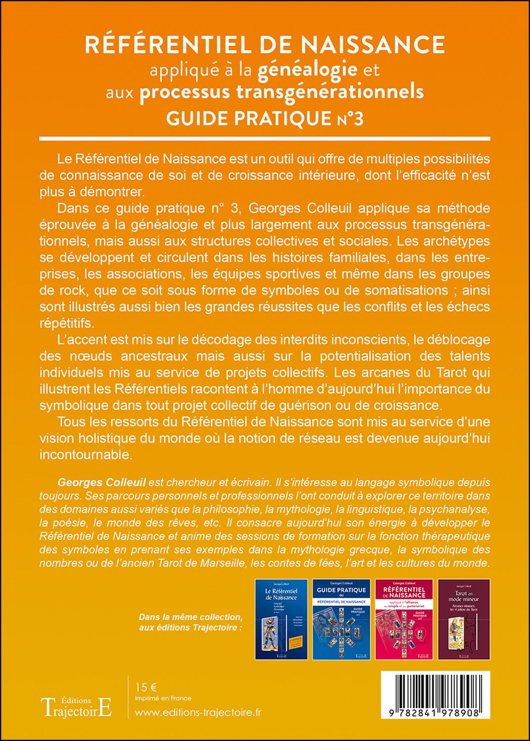 Dans ce guide pratique n° 3, Georges Colleuil applique sa méthode éprouvée à la généalogie et plus largement aux processus transgénérationnels, mais aussi aux structures collectives et sociales. Les archétypes se développent et circulent dans les histoires familiales, dans les entreprises, les associations, les équipes sportives et même dans les groupes de rock, que ce soit sous forme de symboles ou de somatisations ; ainsi sont illustrés aussi bien les grandes réussites que les conflits et les échecs répétitifs.