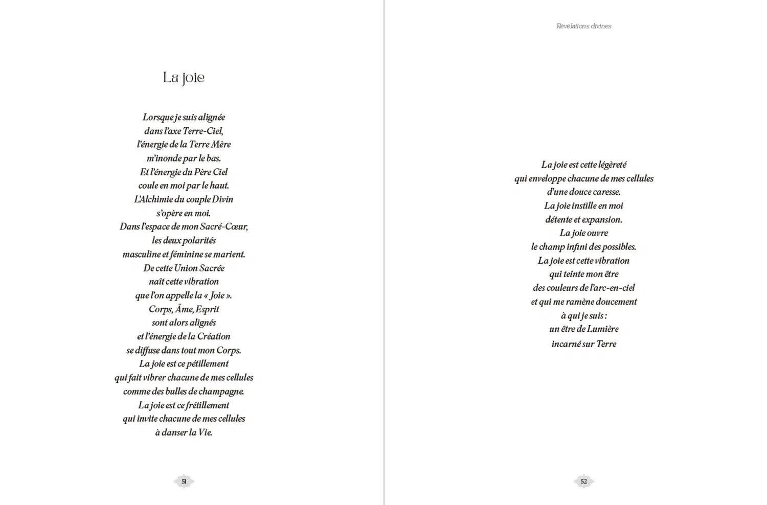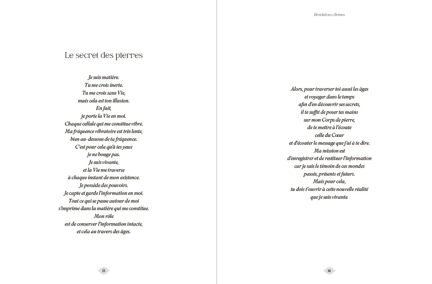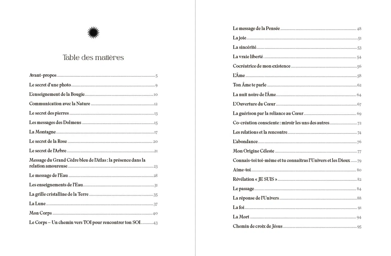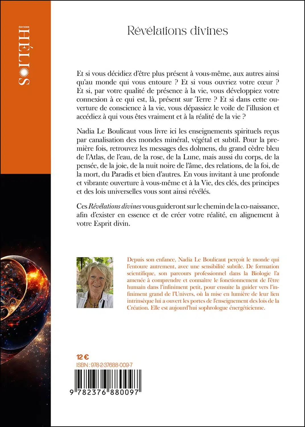 Et si vous décidiez d’être plus présent à vous-mêmes, aux autres ainsi qu’au monde qui vous entoure ? Et si vous ouvriez votre cœur ? Et si, par votre qualité de présence à la vie, vous développiez votre connexion à ce qui est, là, présent sur Terre ? Et si, dans cette ouverture de conscience à la vie, vous dépassiez le voile de l’illusion et accédiez à qui vous êtes vraiment et à la réalité de la vie ? Nadia Le Boulicaut vous livre ici les enseignements spirituels reçus par canalisation des mondes minéral, végétal et subtil. Pour la première fois, retrouvez les messages des dolmens, du grand cèdre bleu de l’Atlas, de l’eau, de la rose, de la Lune, mais aussi du corps, de la pensée, de la joie, de la nuit noire de l’âme, des relations, de la foi, de la mort, du Paradis et bien d’autres. En vous invitant à une profonde et vibrante ouverture à vous-mêmes et à la Vie, des clés, des principes et des lois universelles vous sont ainsi révélés. Ces Révélations divines vous guideront sur le chemin de la co-naissance, afin d’exister en essence et de créer votre réalité, en alignement à votre Esprit Divin.