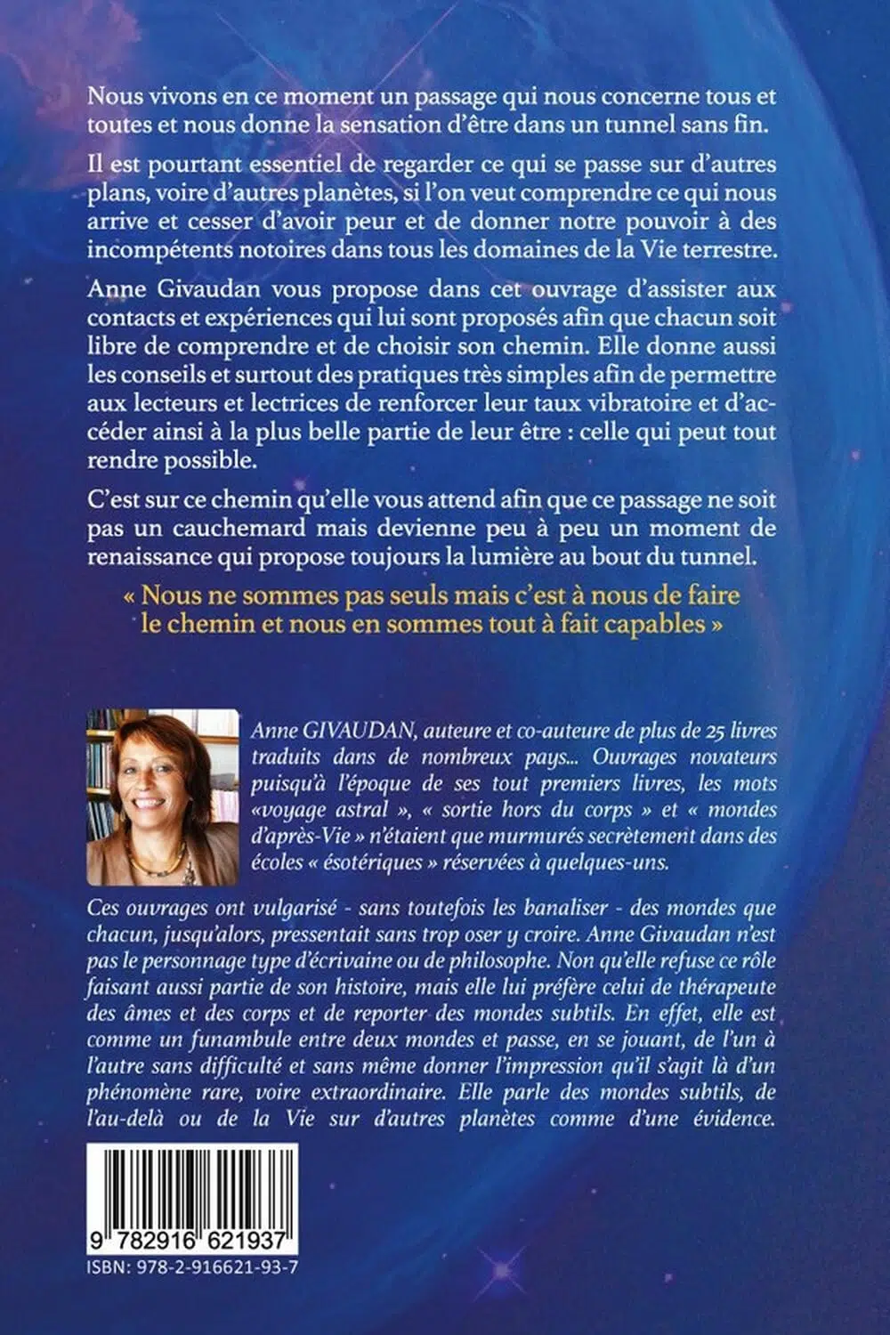 Anne Givaudan vous propose dans cet ouvrage d’assister aux contacts et expériences qui lui sont proposés afin que chacun soit libre de comprendre et de choisir son chemin. Elle donne aussi les conseils et surtout des pratiques très simples afin de permettre aux lecteurs et lectrices de renforcer leur taux vibratoire et d’accéder ainsi à la plus belle partie de leur être : celle qui peut tout rendre possible.