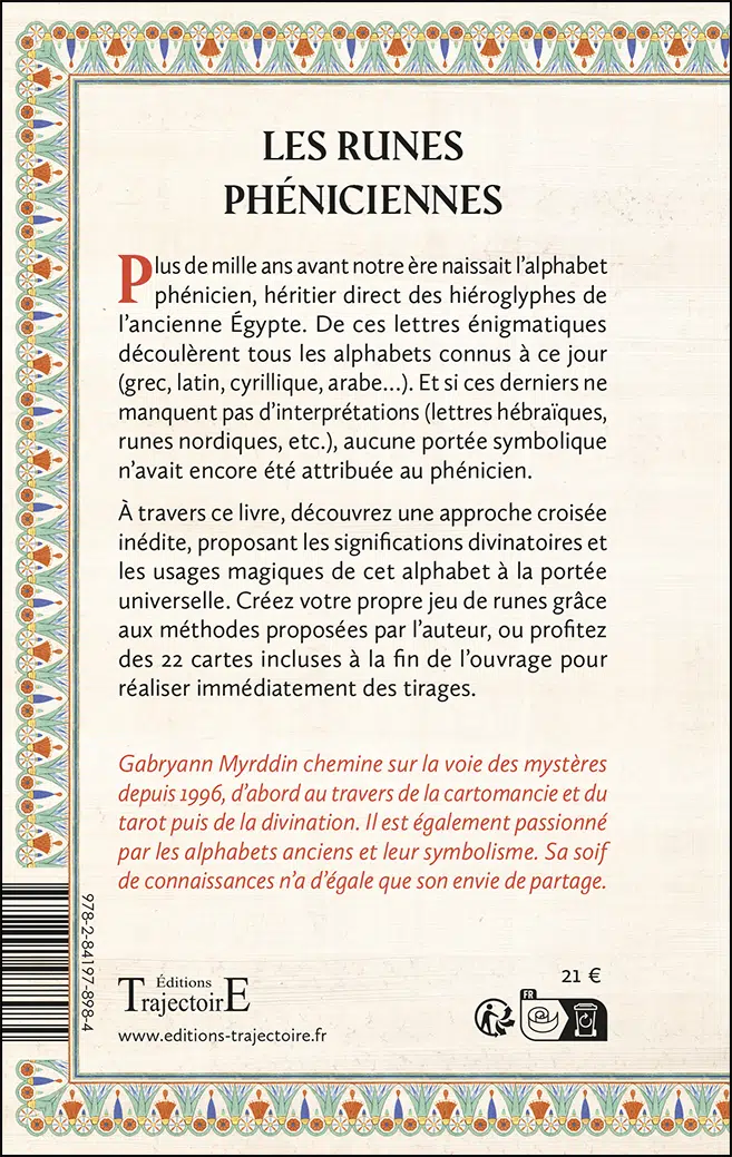 Si ce livre vous explique comment concevoir votre propre jeu de runes basé sur cet alphabet, vous trouverez aussi 22 petites cartes parfaitement utilisables pour vous y essayer, et découvrir la richesse de son langage et de ses usages.