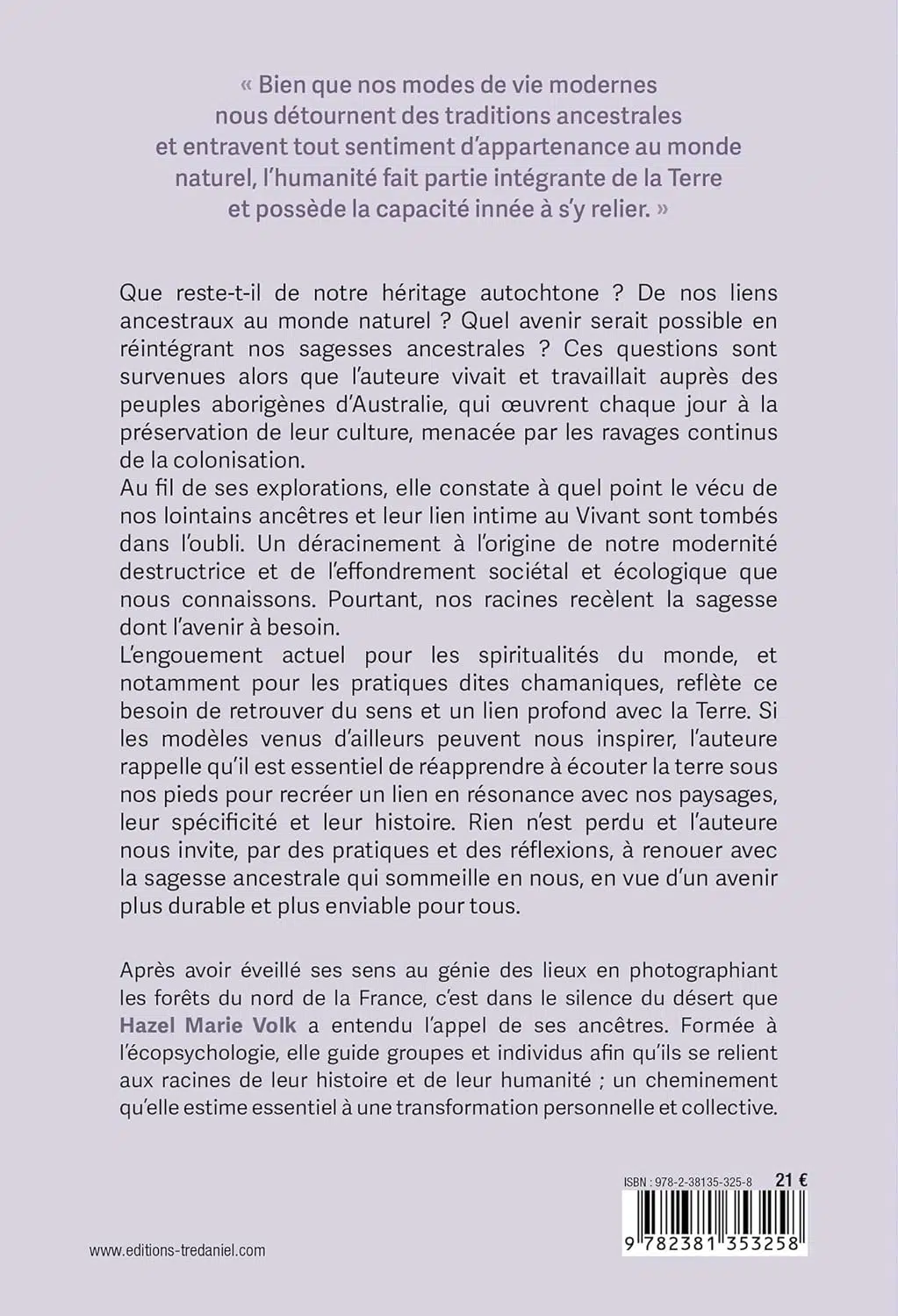 Que reste-t-il de notre héritage autochtone ? De nos liens ancestraux au monde naturel ? Quel avenir serait possible en réintégrant nos sagesses ancestrales ? Ces questions sont survenues alors que l'auteure vivait et travaillait auprès des peuples aborigènes d'Australie, qui œuvrent chaque jour à la préservation de leur culture, menacée par les ravages continus de la colonisation. Au fil de ses explorations, elle constate à quel point le vécu de nos lointains ancêtres et leur lien intime au Vivant sont tombés dans l'oubli. Un déracinement à l'origine de notre modernité destructrice et de l'effondrement sociétal et écologique que nous connaissons. Pourtant, nos racines recèlent la sagesse dont l'avenir à besoin.