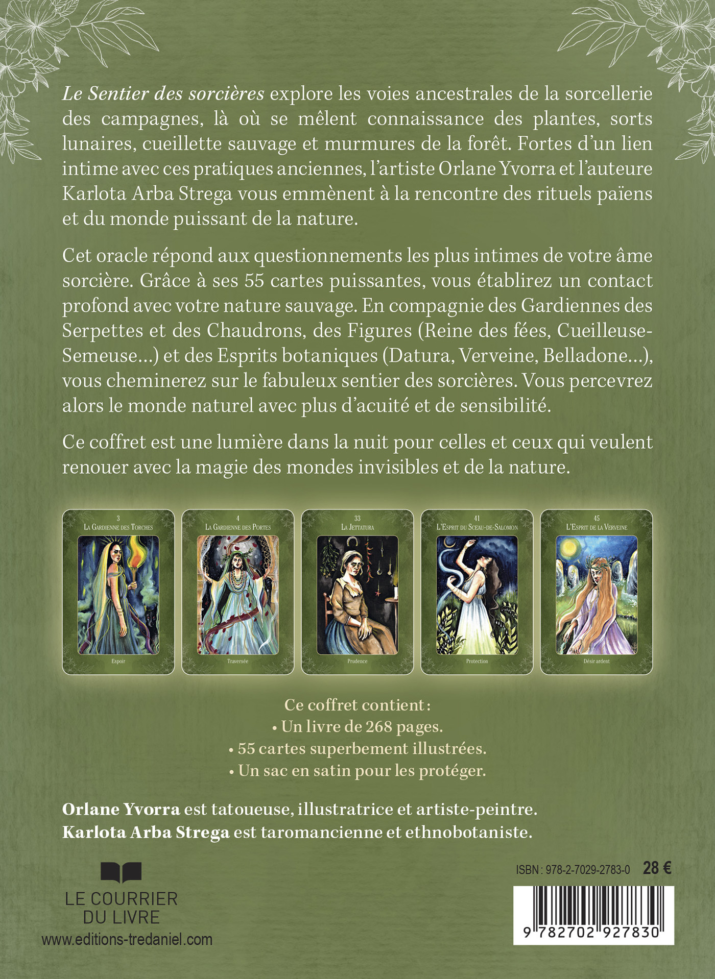 Cet oracle répond aux questionnements les plus intimes de votre âme sorcière. Grâce à ses 55 cartes puissantes, vous établirez un contact profond avec votre nature sauvage. En compagnie des Gardiennes des Serpettes et des Chaudrons, des Figures (Reine des fées, Cueilleuse-Semeuse...) et des Esprits botaniques (Datura, Verveine, Belladone…), vous cheminerez sur le fabuleux sentier des sorcières. Vous percevrez alors le monde naturel avec plus d'acuité et de sensibilité.