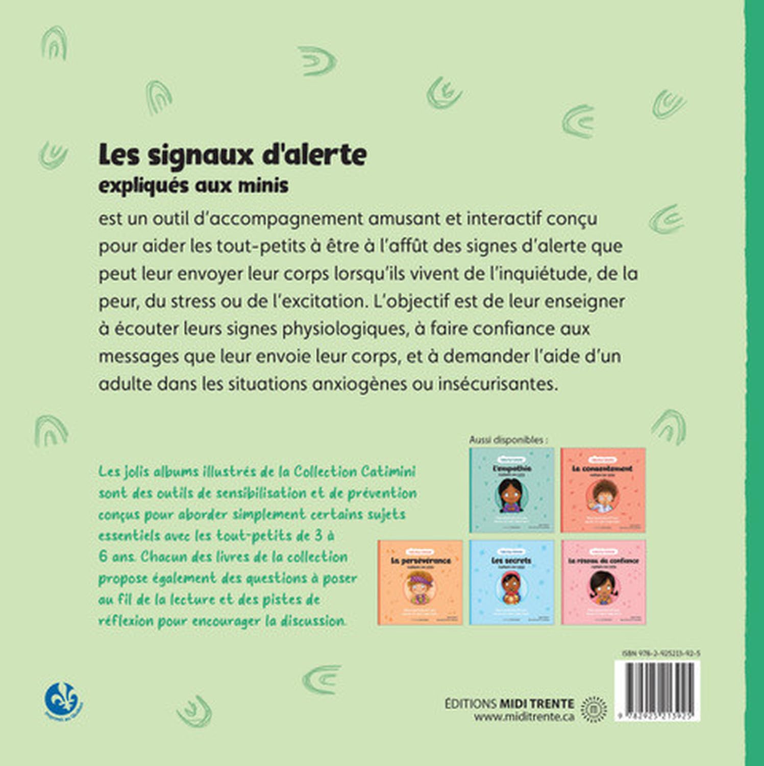 Cet outil d’accompagnement amusant et interactif a été conçu pour aider les tout-petits à être à l’affût des signes d’alerte que peut leur envoyer leur corps lorsqu’ils vivent de l’inquiétude, de la peur, du stress ou de l’excitation. L’objectif est de leur enseigner à écouter leurs signes physiologiques, à faire confiance aux messages que leur envoie leur corps, et à demander l’aide d’un adulte dans les situations anxiogènes ou insécurisantes.