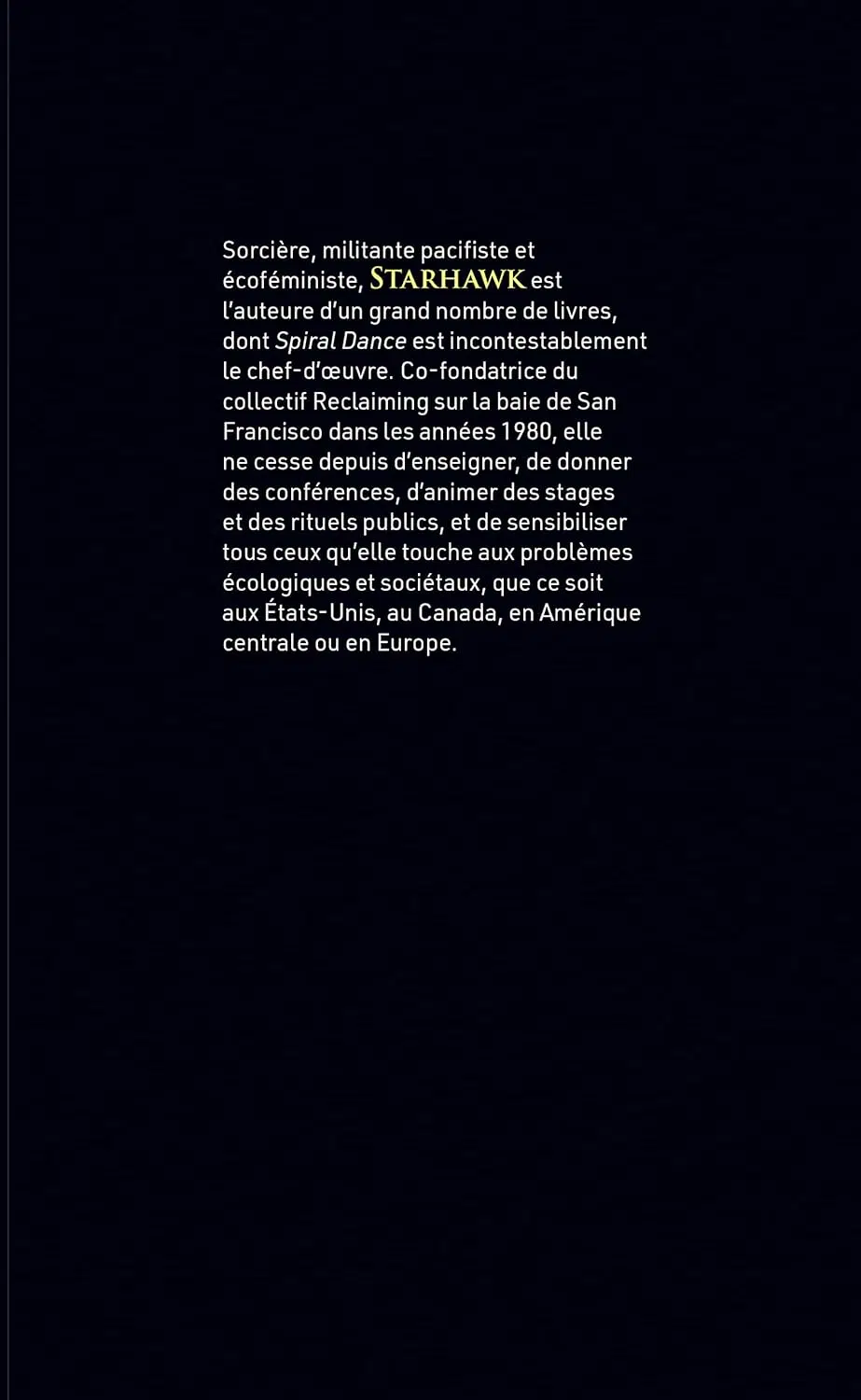 Spiral Dance est le livre de référence du renouveau de la Sorcellerie : Starhawk exhume, transmet et renouvelle les traditions et pratiques de la Sorcellerie.