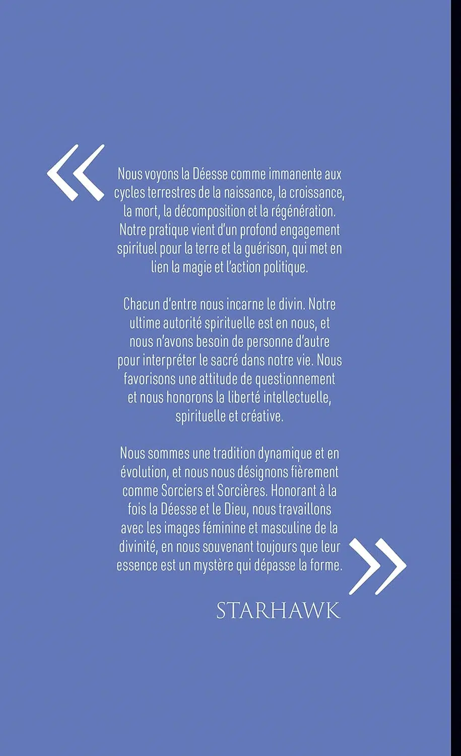 Starhawk donne une brillante vision d'ensemble de l'histoire de la religion de la Déesse, en évoquant sa répression, et sa réémergence aujourd'hui sous l'appellation de Wicca ; ce travail laisse une marque indélébile sur la conscience féministe dans sa dimension spirituelle. Starhawk montre également comment la religion de la Déesse et la pratique de ses rituels se sont développées et adaptées depuis sa réémergence dans les années 80, et comment ces changements ont influencé et renforcé sa propre démarche.