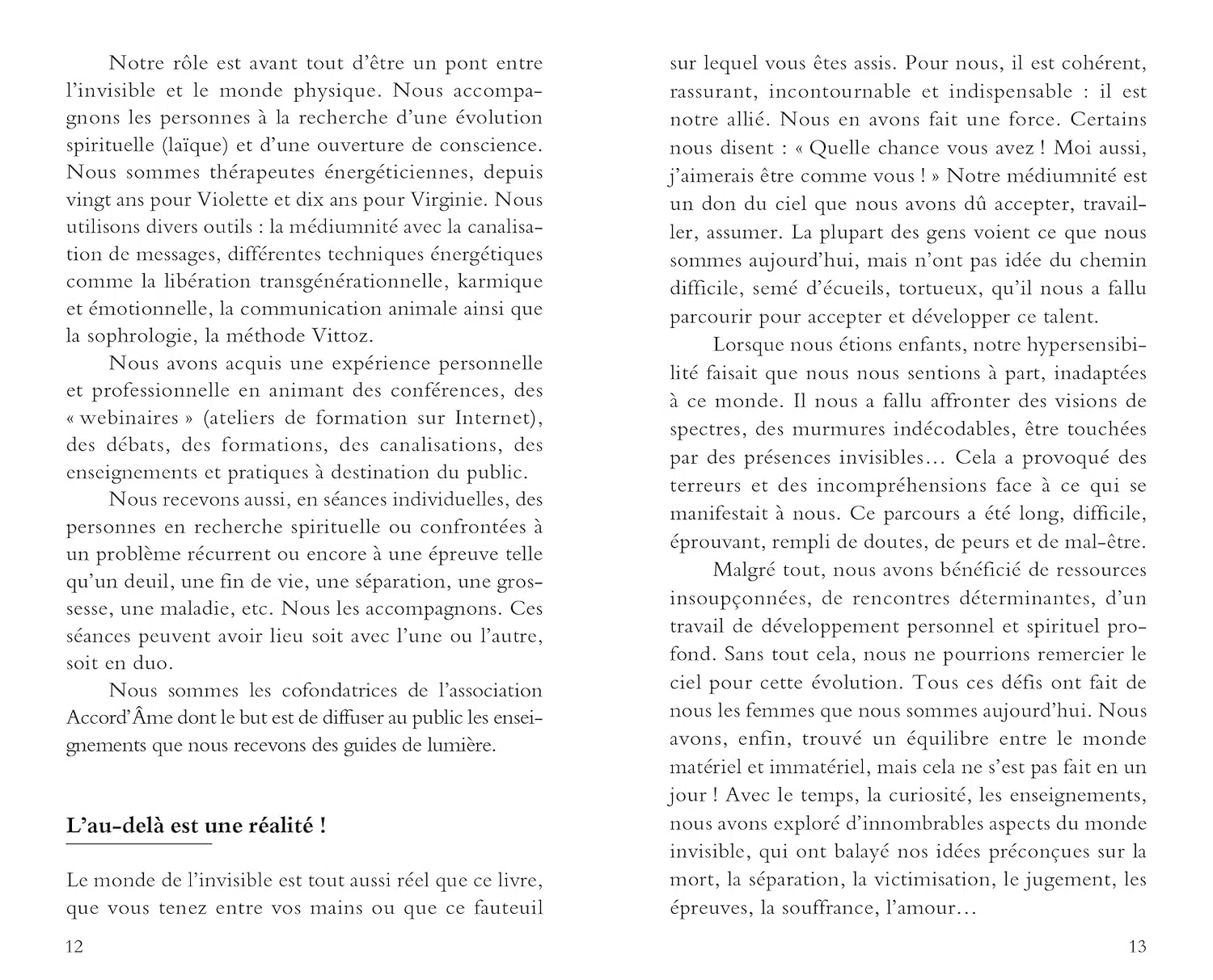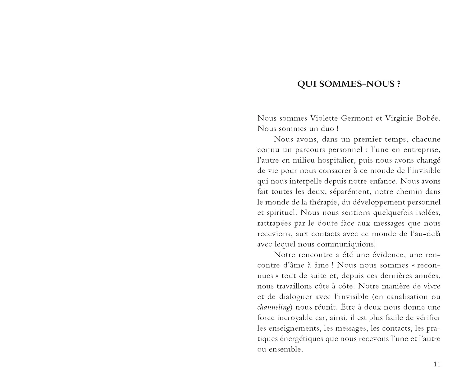 Virginie Bobée et Violette Germont sont thérapeutes énergéticiennes et médiums. Elles reçoivent des messages et canalisations de l’au-delà (guides, défunts…), et ont fondé ensemble Accord'Âme.