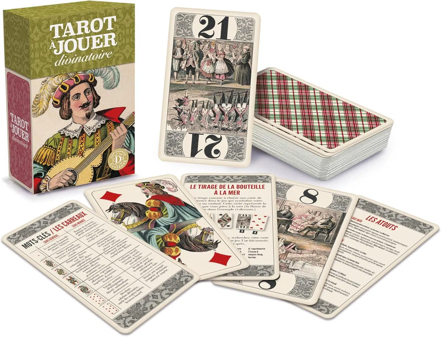 Dusserre, la maison d’édition de la cartomancie, met à l’honneur Le Tarot à Jouer. La tarologie revisitée et mise à l’honneur au travers de ce jeu divinatoire basé sur le jeu de tarot à jouer traditionnel avec de magnifiques illustrations vintage.