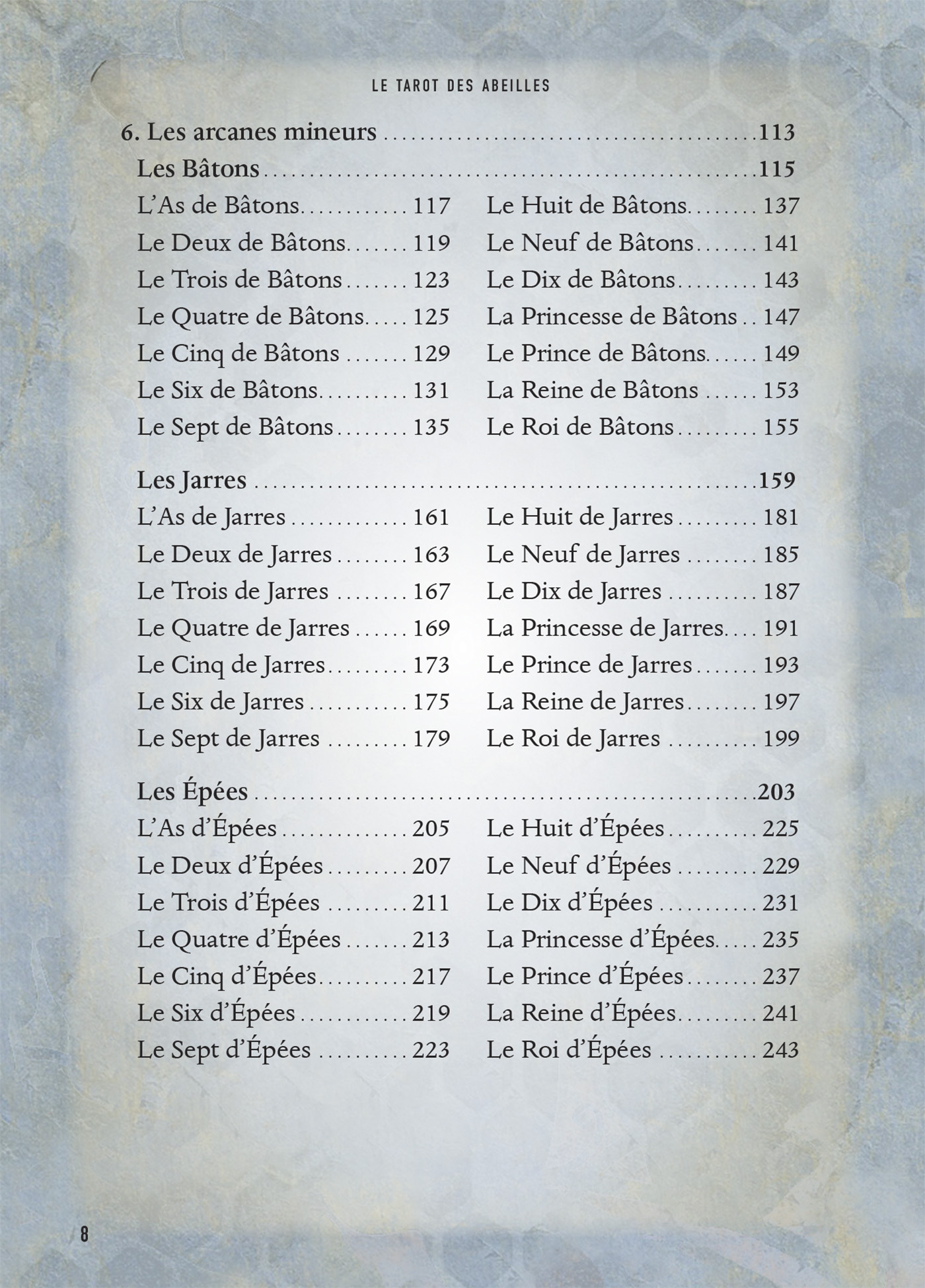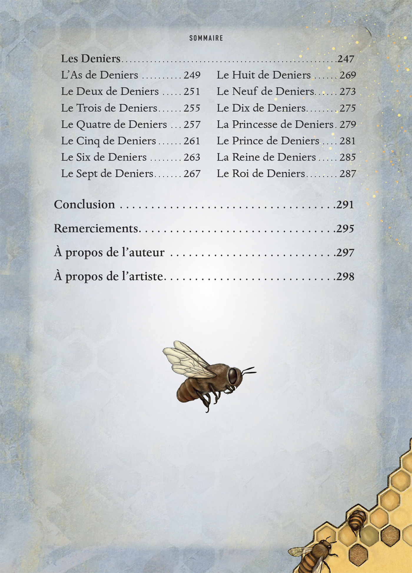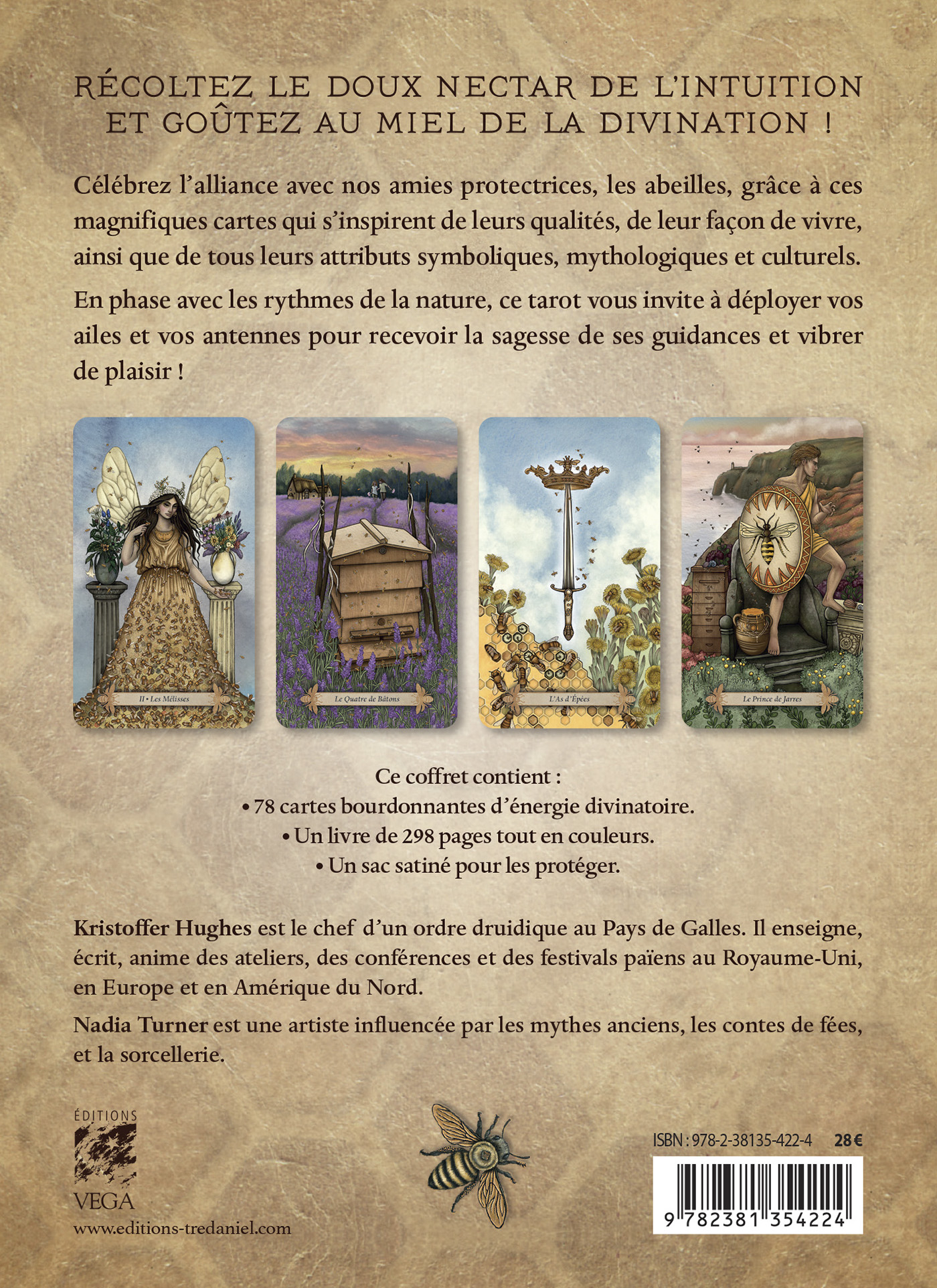 Ce livre vous guide à travers le symbolisme et la signification de chaque carte. Avec délicatesse, Kristoffer Hughes donne vie au rucher, en mettant en lumière les archétypes d’abeilles et leurs attributs mythologiques et culturels dans les arcanes Majeurs. Les arcanes Mineurs - composés de bâtons, de jarres, d'épées et de deniers - explorent le cycle de vie des abeilles qui bourdonnent depuis des millénaires en harmonie avec l'humanité. Enrichi de mots-clefs, d’interprétations spécifiques pour lire au mieux les cartes droites et inversées, et de six méthodes de tirages originales, inspirés par les abeilles, ce livre vous aidera au quotidien à tirer le meilleur parti de votre jeu.