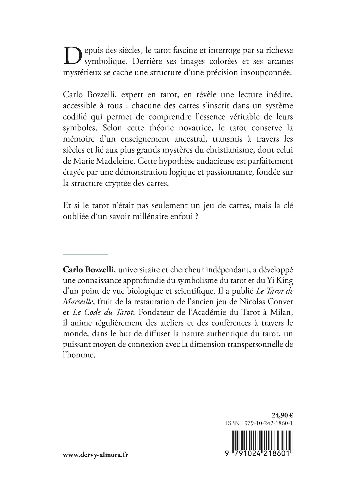 Carlo Bozzelli, expert en tarot, en révèle une lecture inédite, accessible à tous : chacune des cartes s’inscrit dans un système codifié qui permet de comprendre l’essence véritable de leurs symboles. Selon cette théorie novatrice, le tarot conserve la mémoire d’un enseignement ancestral, transmis à travers les siècles et lié aux plus grands mystères du christianisme, dont celui de Marie Madeleine. Cette hypothèse audacieuse est parfaitement étayée par une démonstration logique et passionnante, fondée sur la structure cryptée des cartes.