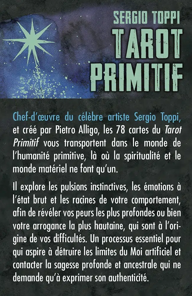 Un tarot magnifiquement illustré par le célèbre dessinateur de bandes dessinées Sergio Toppi dont les cartes figurent un univers "primitif", originel et spirituel.Chef-d'œuvre du célèbre artiste Sergio Toppi, et créé par Pietro Alligo, les 78 cartes du Tarot Primitif vous transportent dans le monde de l'humanité primitive, là où la spiritualité et le monde matériel ne font qu'un.