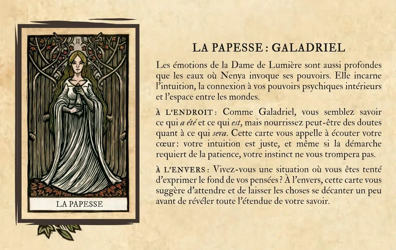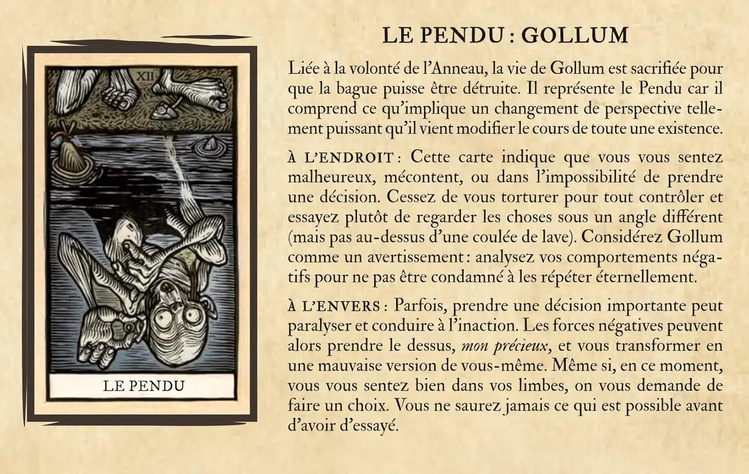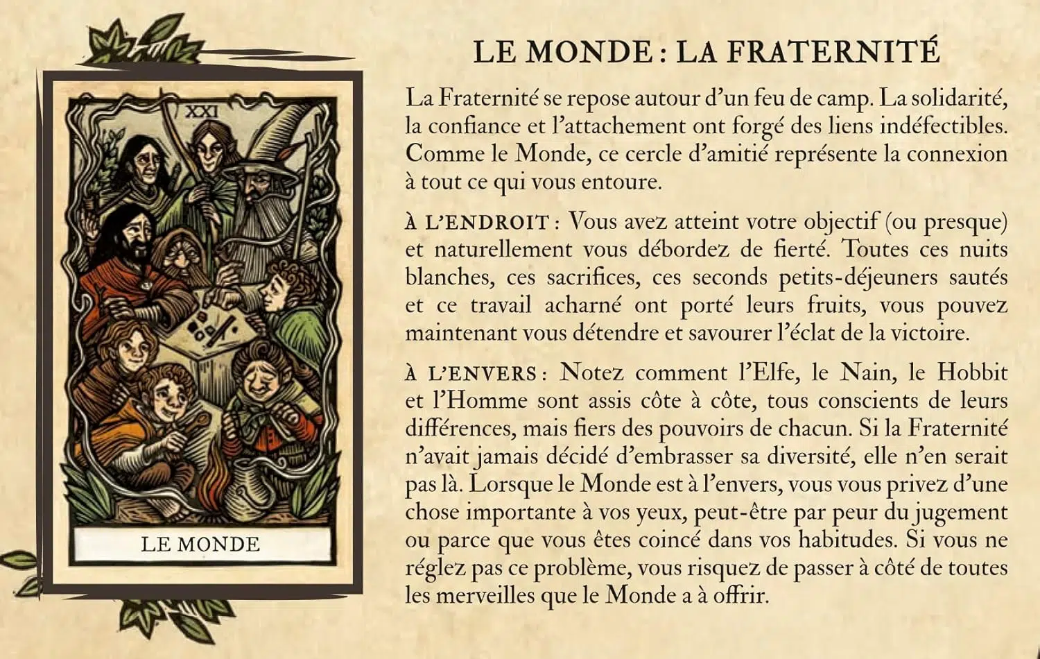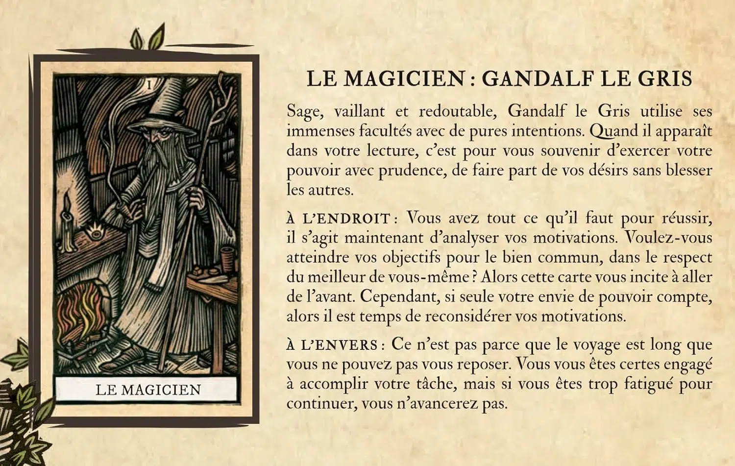 En premier lieu pour les amoureux de vieux jeux de tarot aux visuels de gravure ancienne, celui-ci reprend les personnages et thèmes de l’univers de Tolkien : Le seigneur des anneaux. Retrouvez donc Gandalf, Galadriel, Frodon et tous les autres. Les arcanes majeurs et figures de cour des mineurs vous rappelleront ces histoires, et les cartes numérales (non illustrées) rappelleront les tarots anciens. Un grand fascicule prend la peine de détailler chacune des 78 cartes du jeu, afin d’aider à leur interprétation.