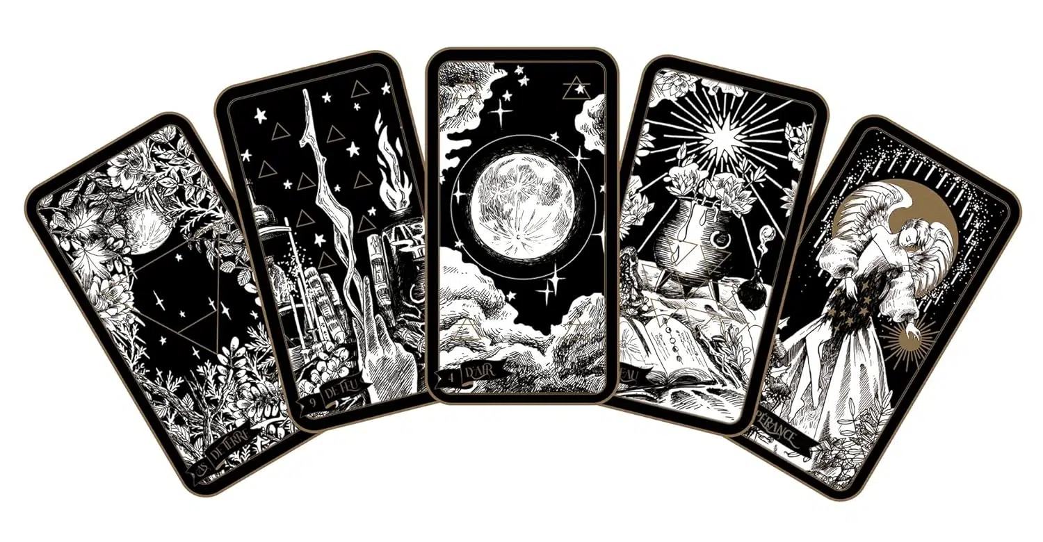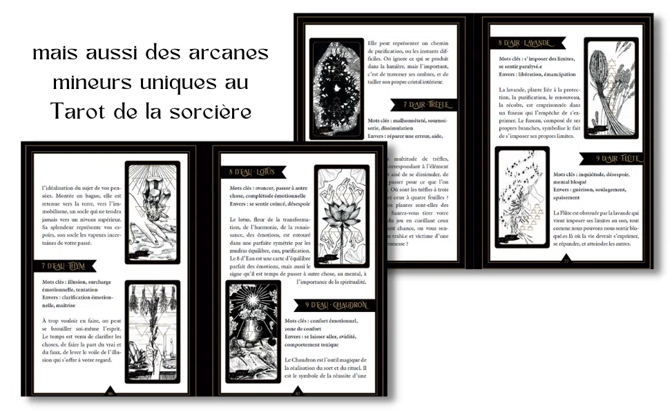 Un tarot au graphisme puissant, entièrement noir et blanc, parfois rehaussé de quelques dorures. Ses dessins vous emportent dans une dimensions sorcière au delà des clichés, tout en conservant la puissance de nombreux symboles et archétypes.