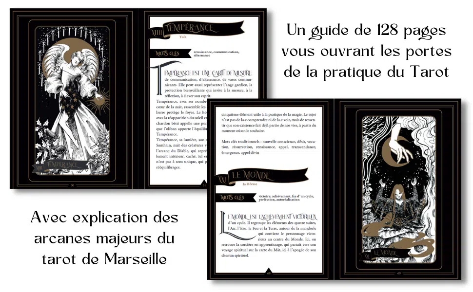 Liés aux 4 éléments (Air, Eau, Feu et Terre), les 78 arcanes noirs et dorés de ce deck sont créés et illustrés à la main par Bérengère Demoncy. Ce jeu comprend aussi un guide de 128 pages vous ouvrant les portes de la pratique du Tarot et vous donnant les significations de chaque carte ainsi que différentes manières d'effectuer des tirages.