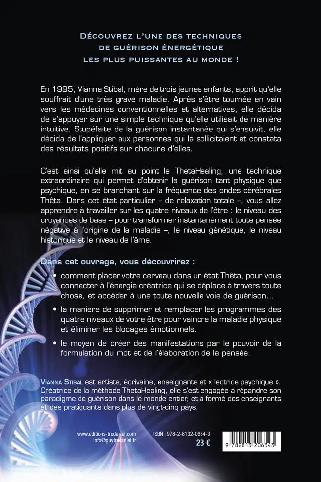 C’est ainsi qu’elle mit au point le Theta Healing, une technique extraordinaire qui permet d’obtenir la guérison tant physique que psychique, en se branchant sur la fréquence des ondes cérébrales Thêta. Dans cet état particulier – de relaxation totale –, vous allez apprendre à travailler sur les quatre niveaux de l’être : le niveau des croyances de base – pour transformer instantanément toute pensée négative à l’origine de la maladie –, le niveau génétique, le niveau historique et le niveau de l’âme.