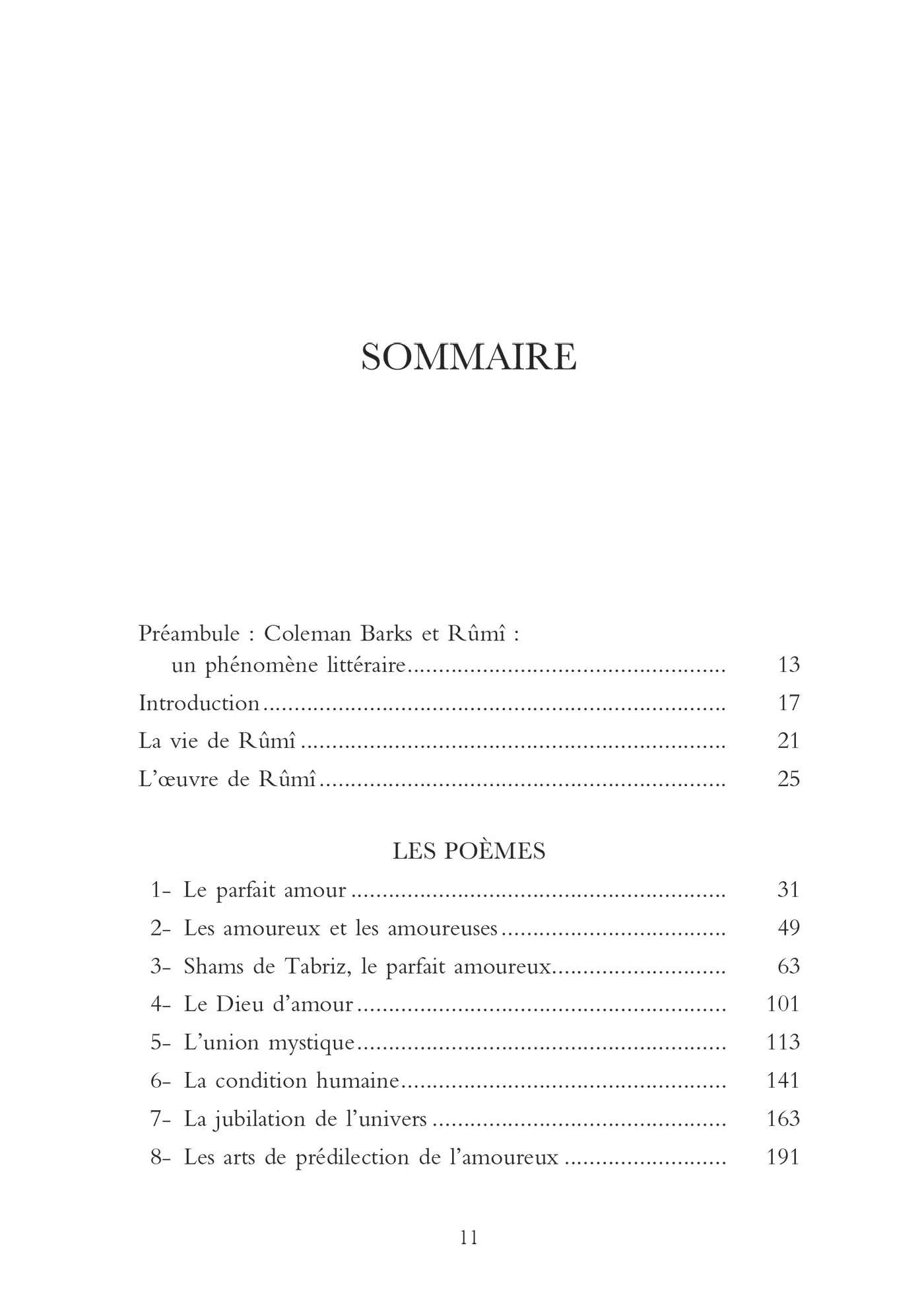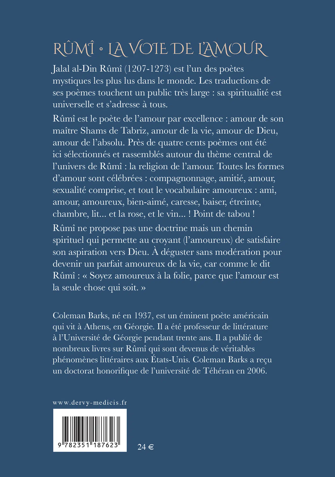 Rûmî est le poète de l’amour par excellence : amour de son maitre Shams de Tabriz, amour de la vie, amour de Dieu, amour de l’absolu. Près de quatre cents poèmes ont été ici sélectionnés et rassemblés autour du thème central de l’univers de Rûmî : la religion de l’amour. Toutes les formes d’amour sont célébrées : compagnonnage, amitié, amour, sexualité comprise et tout le vocabulaire amoureux : ami, amour, amoureux, bien-aimé, caresse, baiser, étreinte, chambre, lit… et la rose, et le vin... ! Point de tabou !