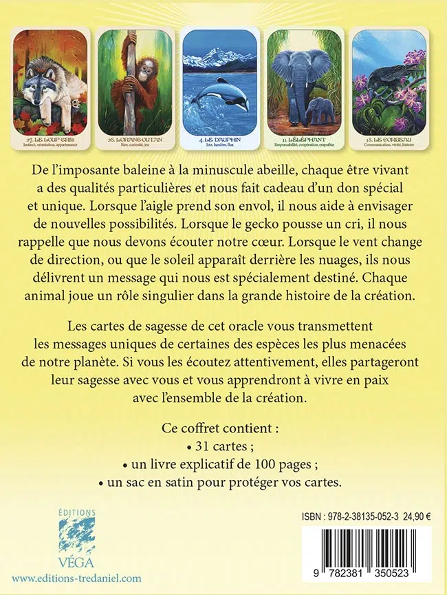 Les cartes d'enseignement de sagesse de cet oracle vous transmettent les messages uniques de certaines des espèces les plus menacées de notre planète. Si vous les écoutez attentivement, elles partageront leur sagesse avec vous et vous apprendront à vivre en paix avec l’ensemble de la création.