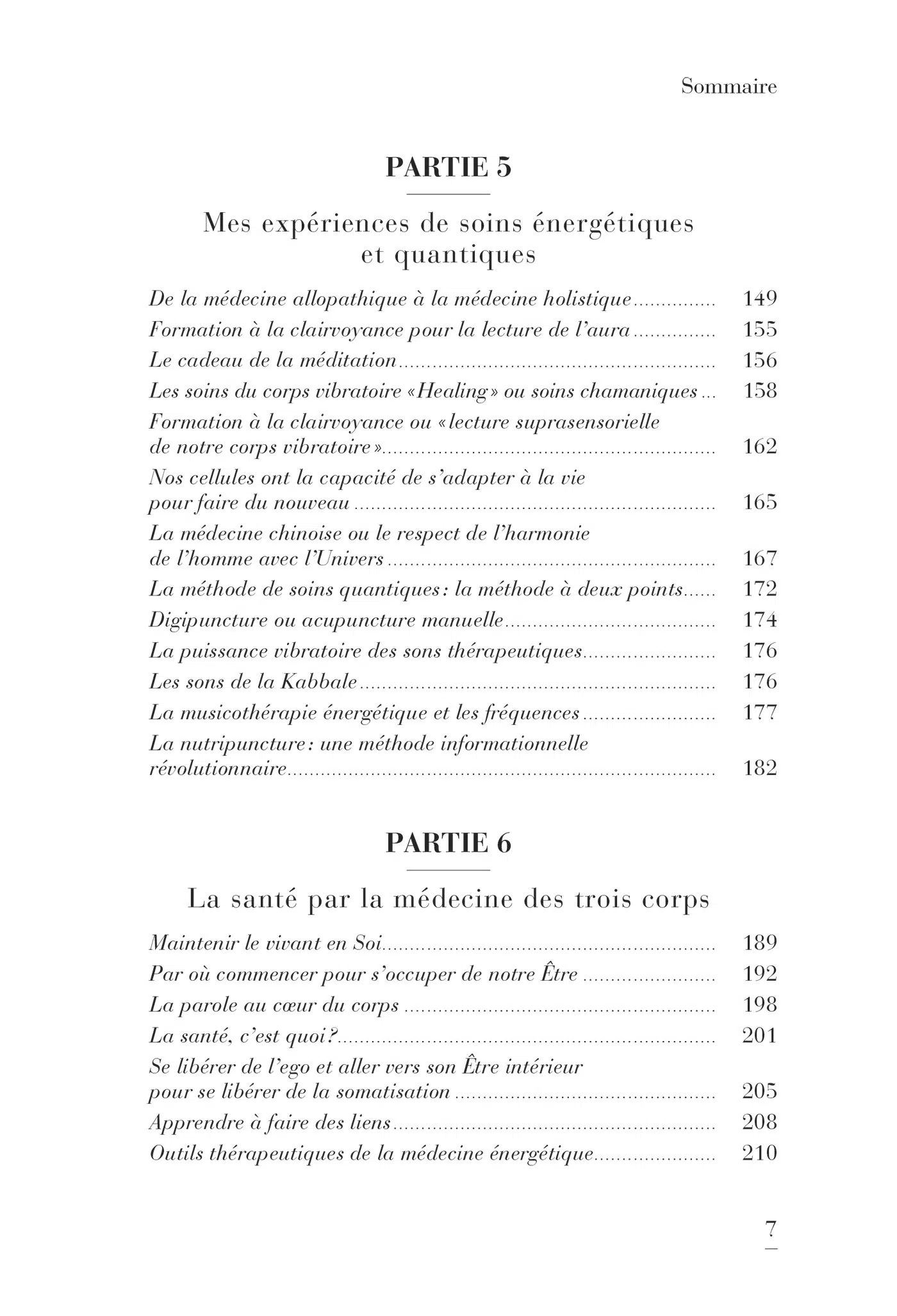 Bousculée jusque dans sa chair, l'auteure s'interroge sur le lien entre santé, maladie et structure du corps. En parallèle de son travail, elle se forme aux médecines chinoise et énergétique, qui lui apportent des réponses et des prises de conscience initiant un processus d'autoguérison. Après avoir retrouvé intégralement la santé, elle réoriente sa carrière professionnelle en biologie moléculaire et cellulaire, et vit des expériences extrasensorielles qui lui permettent de découvrir notre corps vibratoire et sa structure invisible avec son champ d'informations.