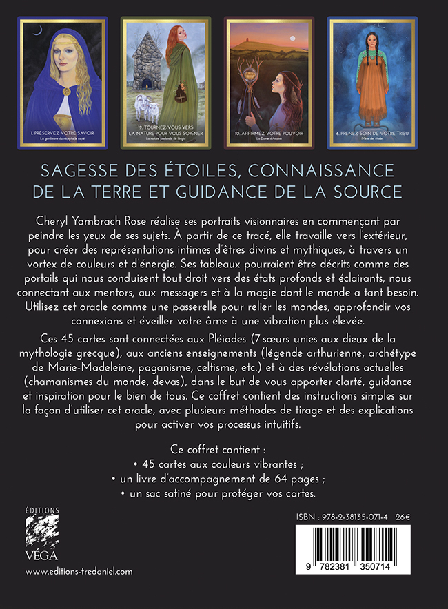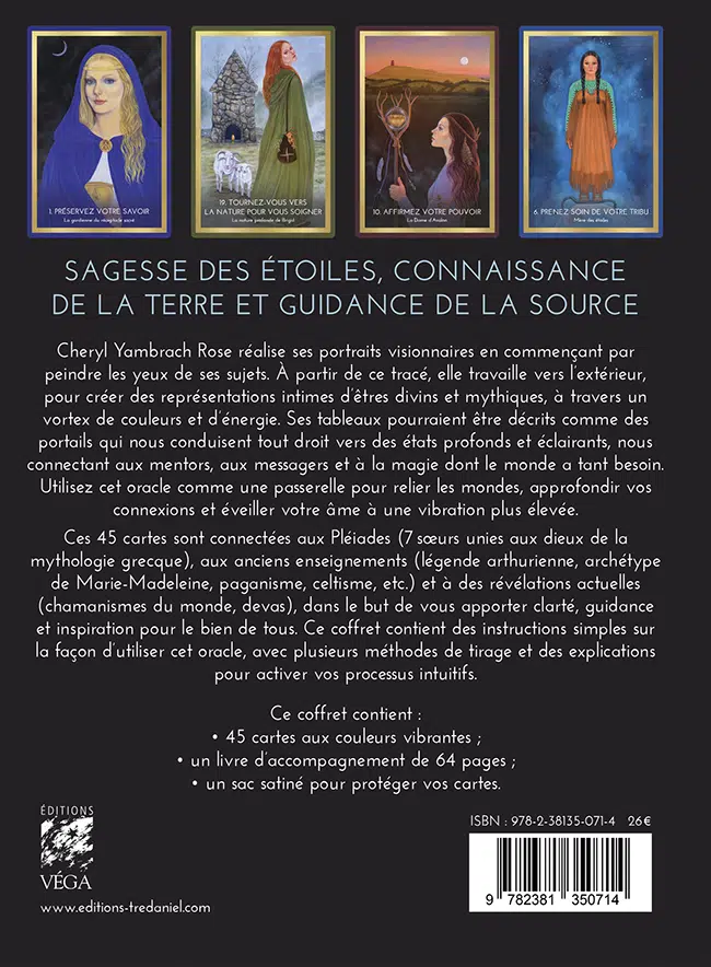 Ces 45 cartes d'enseignement sont connectées aux Pléiades (7 sœurs unies aux dieux de la mythologie grecque), aux anciens enseignements (légende arthurienne, archétype de Marie-Madeleine, paganisme, celtisme, etc.) et des révélations actuelles (chamanismes du monde, devas), dans le but de vous apporter clarté, guidance et inspiration pour le bien de tous. Ce coffret contient des instructions simples sur la façon d'utiliser cet oracle, avec plusieurs méthodes de tirage et des explications pour activer vos processus intuitifs.