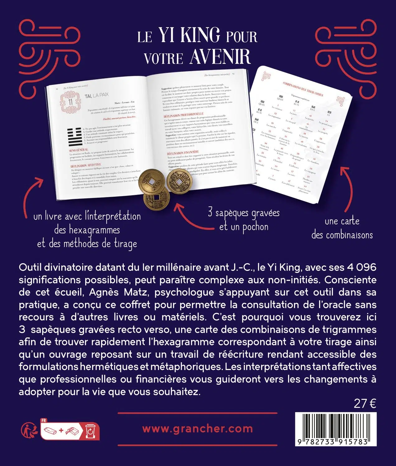 Consciente de cet écueil, Agnès Matz, psychologue s’appuyant sur cet outil dans sa pratique, a conçu ce coffret pour permettre la consultation de l’oracle sans recours à d’autres livres ou matériels. C’est pourquoi vous trouverez ici 3 sapèques gravées recto verso, une carte des combinaisons de trigrammes afin de trouver rapidement l’hexagramme correspondant à votre tirage ainsi qu’un ouvrage reposant sur un travail de réécriture rendant accessible des formulations hermétiques et métaphoriques. Les interprétations tant affectives que professionnelles ou financières vous guideront vers les changements à adopter pour la vie que vous souhaitez.