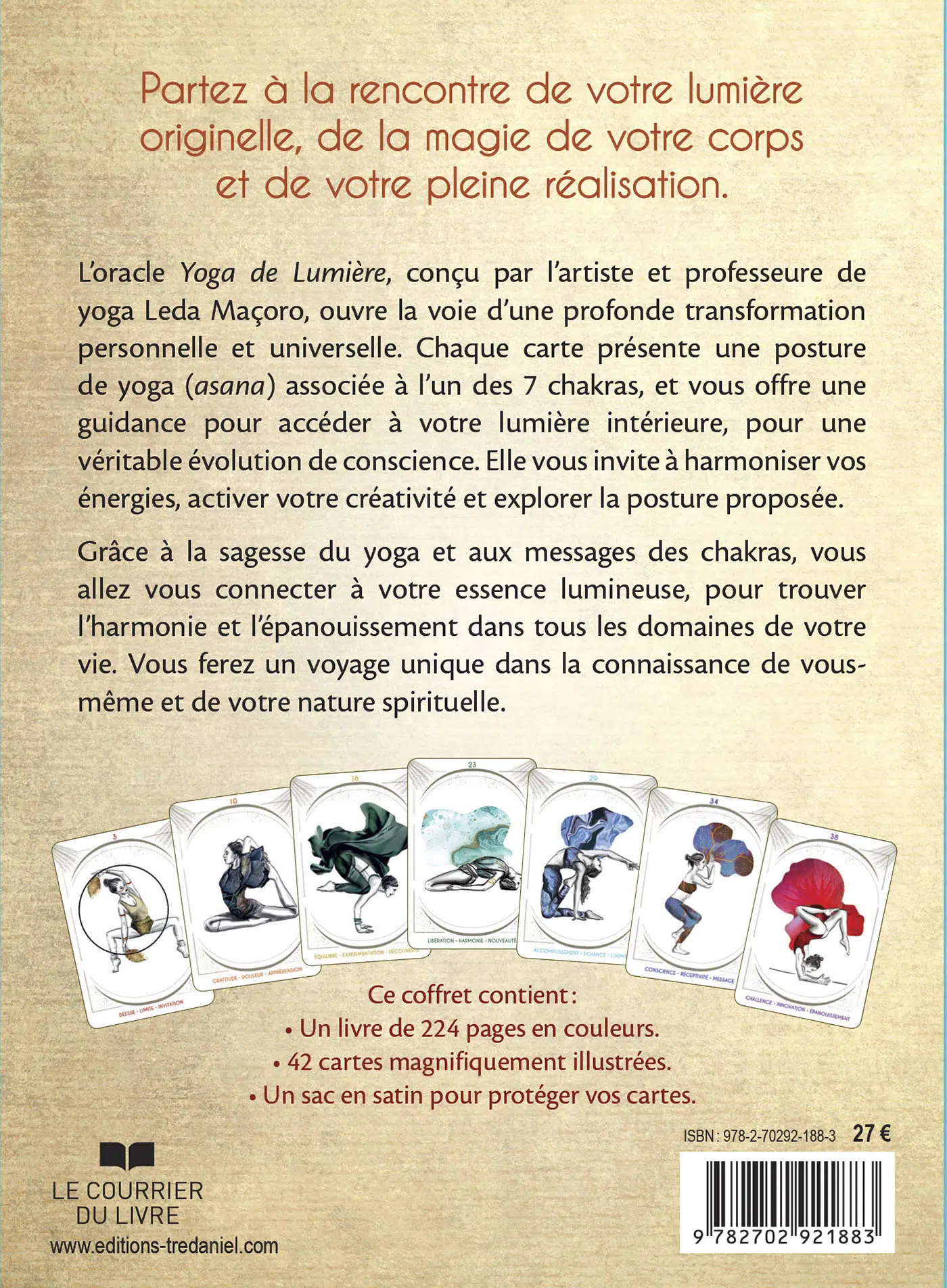 L’oracle Yoga de Lumière, conçu par l’artiste et professeure de yoga Leda Maçoro, ouvre la voie d’une profonde transformation personnelle et universelle. Chaque carte présente une posture de yoga (asana) associée à l’un des 7 chakras, et vous offre une guidance pour accéder à votre lumière intérieure, pour une véritable évolution de conscience. Elle vous invite à harmoniser vos énergies, activer votre créativité et explorer la posture proposée.